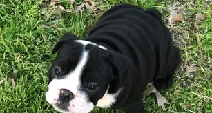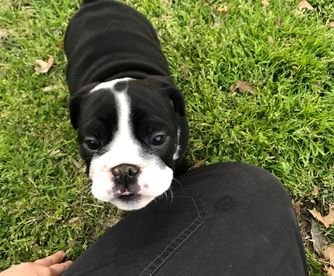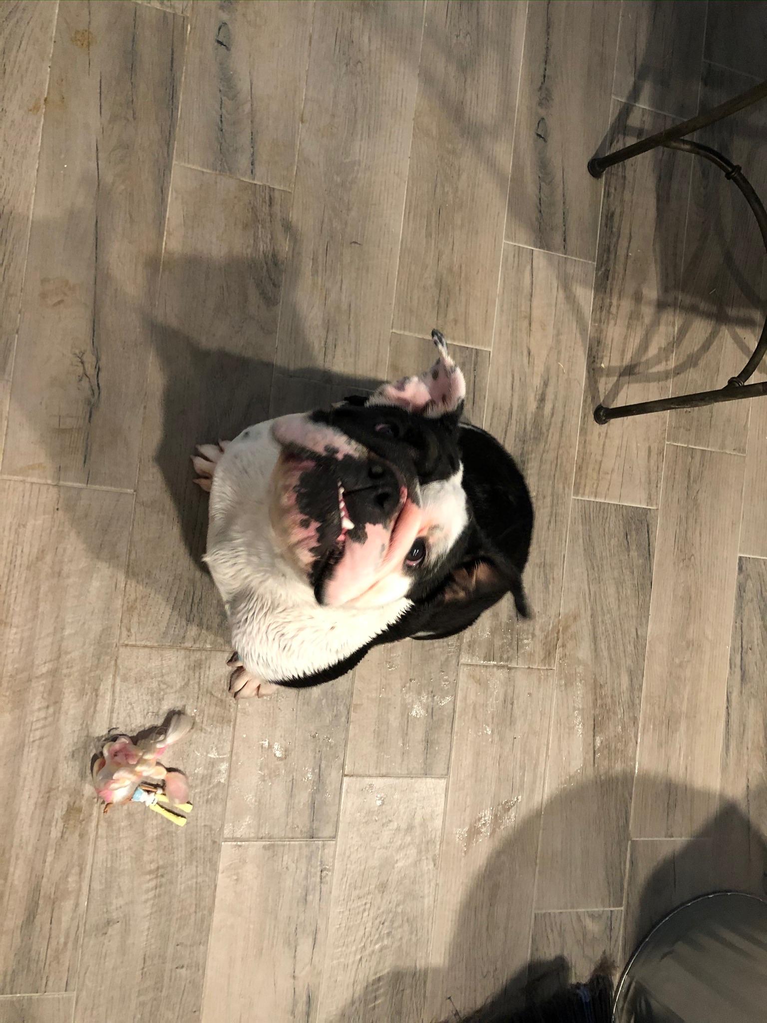 Moo is an average sized (slim-muscular built) black and white piebald English bulldog. She is the daughter of Dam, Georgia, and has been with us since she was born. She is funny, energetic, and love-able. Moo is very funny and makes everyone around her laugh with her goofy looks and actions. She is well behaved and is easily trainable. Moo loves her people and is very good with kids! She enjoys playing hard and sleeping hard!