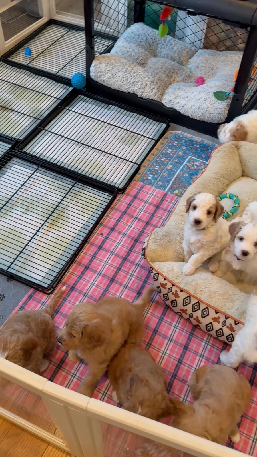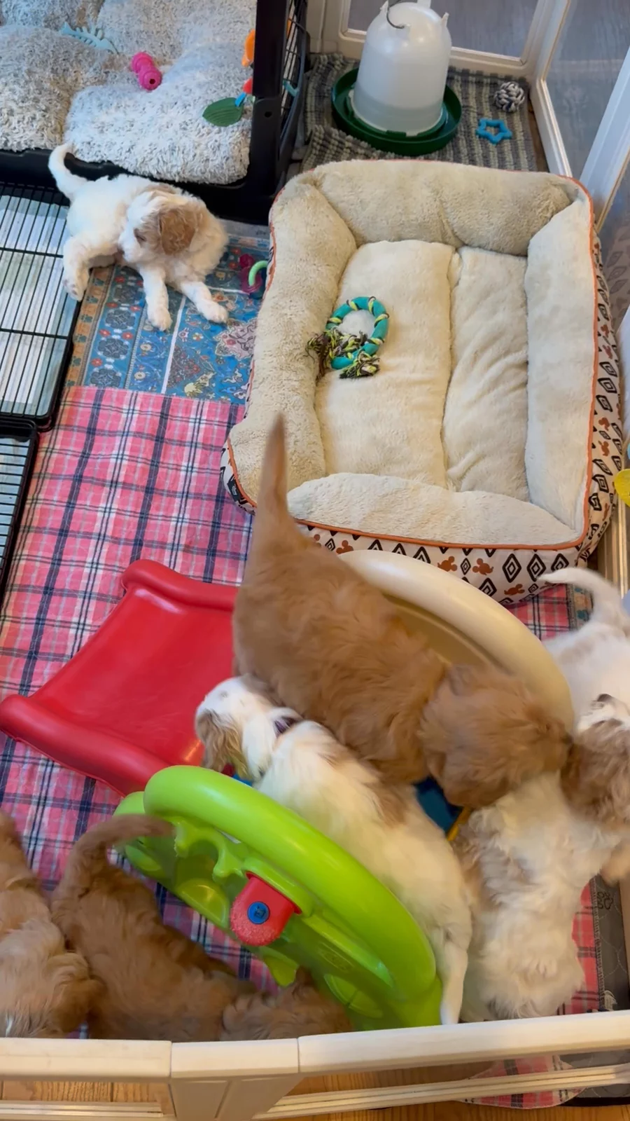 Our puppies include cream, apricot, red, and parti. Colors will vary depending on the parent dogs.