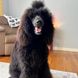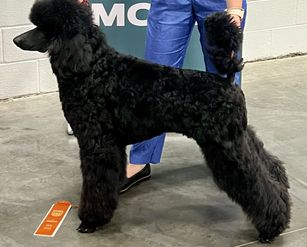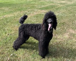 Opal is black-abstract. She has white markings on chest and chin. Opal came to us from Sapphire Poodles. Opal is wonderful. She has had great success in the conformation ring and she is an amazing dog at home with an incredible off switch. She is relaxed and our couch potato dog. She is sweet, biddable, and up for anything. Her chosen "person" is my husband, Salesi.