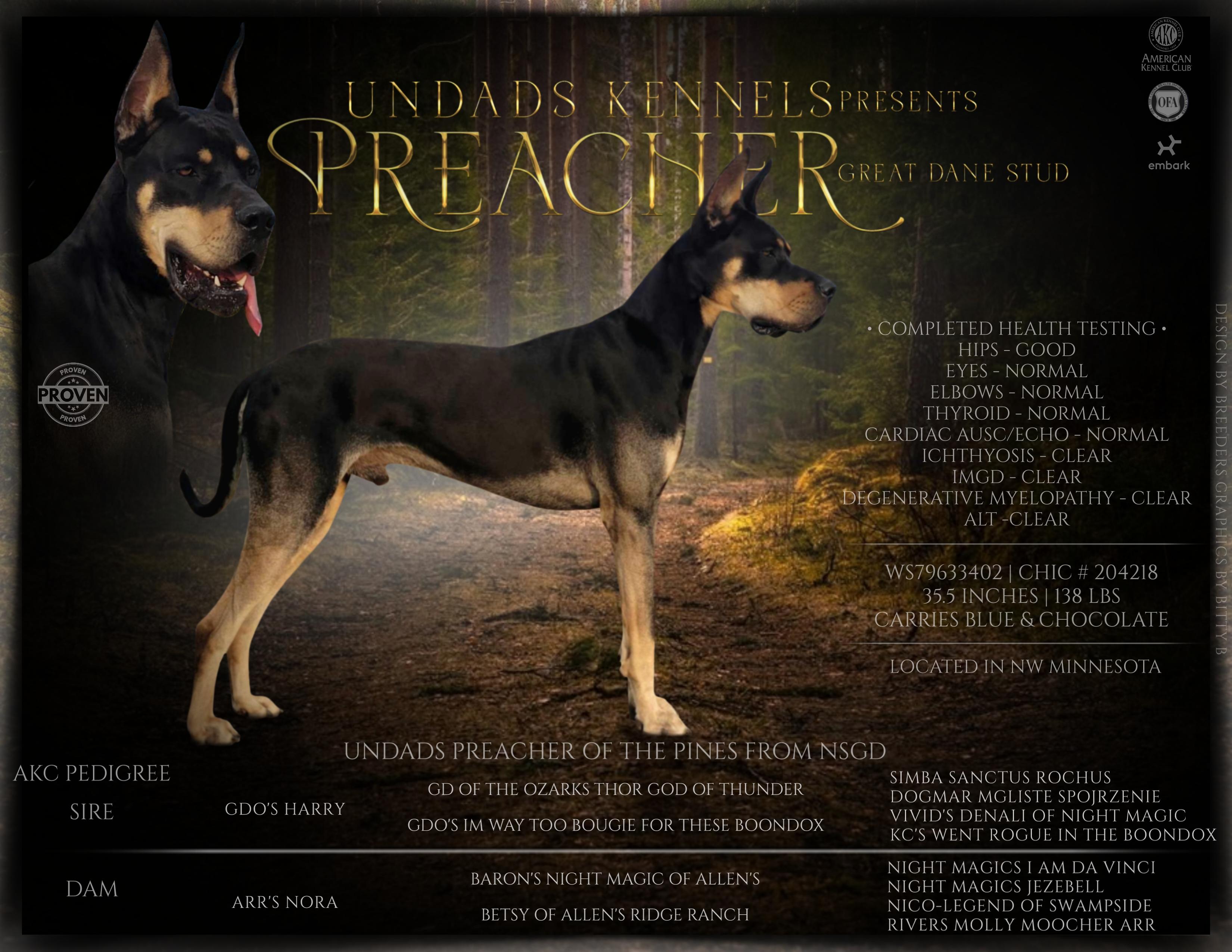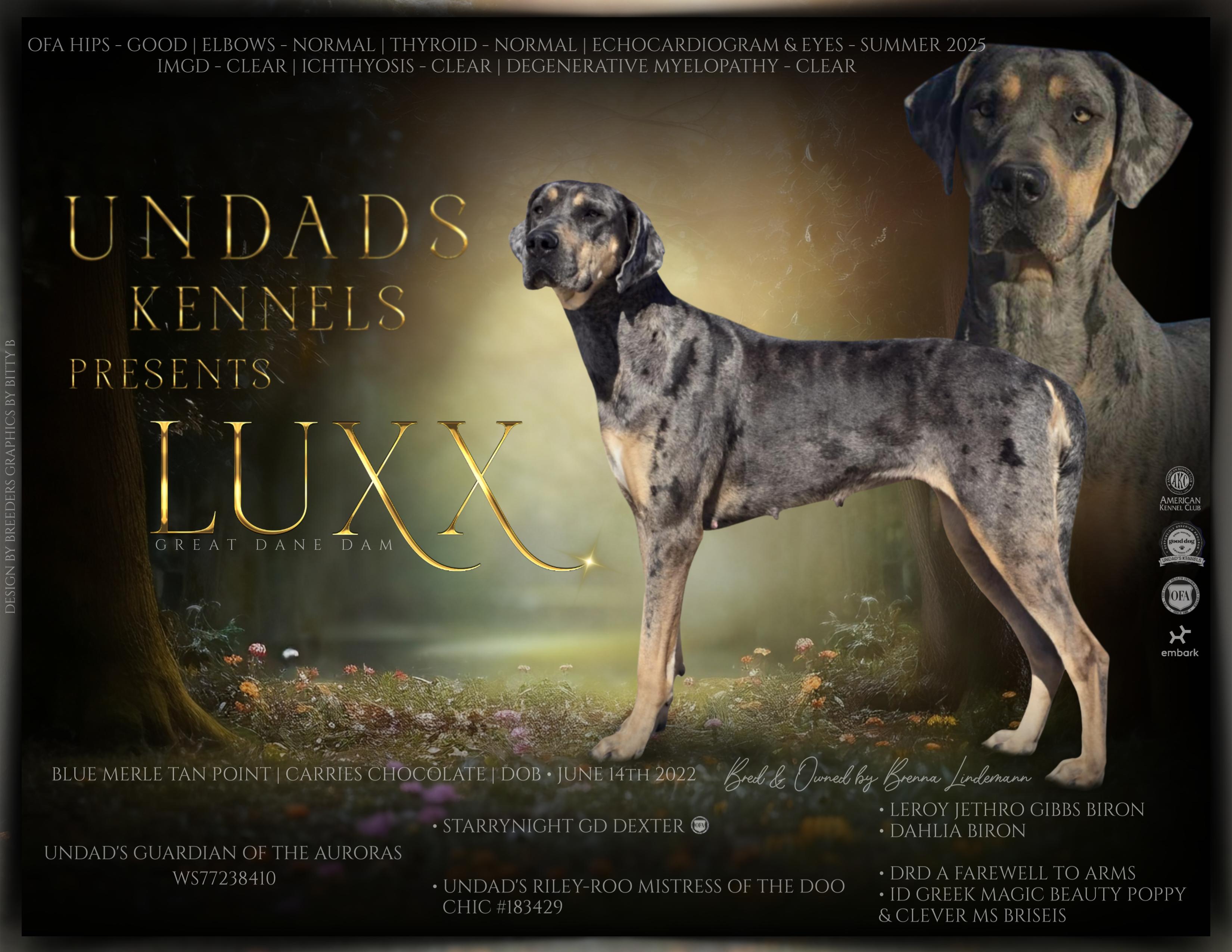 UNDAD'S KENNELS reports to performing the health tests below on their breeding dogs. Ask your breeder about the tests performed on the parents of your litter. Learn more about health testing for Great Danes.