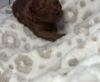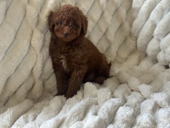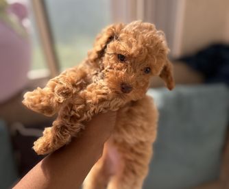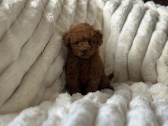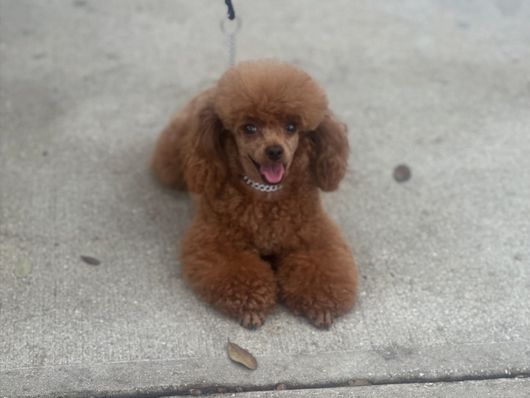 🐾 Amber (Tiny Toy) Amber is a stunning red abstract Miniature Poodle with a heart as warm as her coat. She’s the definition of a perfect family companion—gentle, affectionate, and full of playful charm. Amber adores children and thrives during playtime, yet she also has a calm, nurturing energy that makes her a comforting presence in any home.Her balanced temperament shines through in her puppies, who inherit her sweet nature and joyful spirit—making them ideal pets for families, couples, or individuals looking for a loyal and loving companion. Amber is genetically health tested and passed her OFA exams.