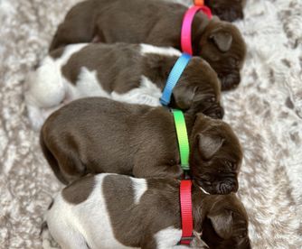 Our German Shorthaired Pointer puppies include liver and white and black and white. Labrador Retriever puppies include black, chocolate, and yellow. Colors will vary depending on the parent dogs.