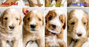 Our Bernedoodle puppies are tri-color. Goldendoodle puppies include cream, apricot, and red. Colors will vary depending on the parent dogs.
