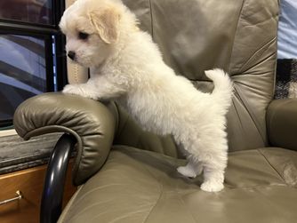 We searched for nearly two years after our beloved 15 year old bichon passed away. We applied for countless rescues and were denied for not having a fenced in yard or not having kids. When we decided to stop wasting money on rescue applications, I knew that I wanted a reputable, code of ethics breeder and it was super important to us that we were not supporting a backyard breeder or someone who disposed of their mama dogs as soon as their breeding usefulness expired. We wanted a breeder whose dogs are a part of their family and are happy and healthy in their forever home. I was cautiously optimistic when I found Annette/Uptown Cotons. She seemed to be exactly who we were looking for. We met over FaceTime and she vetted us as much as we vetted her. She was in the puppy welping room in her house she introduced each of her dogs and educated us all about the Code of Ethics requirements, the genetic health testing, and her process of training the puppies for the first 10 weeks to make sure they were socialized , happy, healthy, confident puppies. I asked for references and she provided several—all of whom had rave reviews. We decided to put a down-payment on a puppy and Annette kept us posted with frequent photos and videos. We went to visit around the 6 week mark and were welcomed into Annette’s home multiple times over our short visit from our east coast home. The puppies and Birdie (Walter’s mama) were clearly in a home full of love and care. The more we talked with Annette the more we knew we made the right decision. Our values were aligned about the health of the puppies too—from nutrition to flea control we were in sync. We picked up Walter (fka Spot) on Dec 31st and flew home. We had sent his airline carrier to Annette in advance so she could get him used to it and he was an absolute champ. Her advance training meant he was paper trained before we brought him home and he travelled without a hitch. He settled in perfectly and now he travels with me to work and has been to 21 states in his first six months. He is the welcome wagon wherever he goes and loves to greet people. It seems his purpose in life is to bring joy and we’ve decided to get him trained as a therapy dog. We’ve had our first nursing home visit and he is confident and unafraid of beeping machines and assistive devices. He loves nothing more than to sit in someone’s lap and be loved on. We love him so much, he is playful and curious but is also content and chill as long as he’s with one of us. He comes with us everywhere and everyone is amazed how well behaved, cute, and friendly he is. We can’t imagine our lives without him and are so grateful we found Annette.