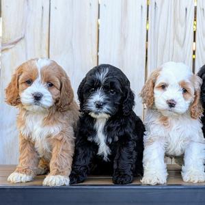 Our Cockapoo puppies include red and white, red, golden, cream, buff and white, buff, black and white, and black. Colors will vary depending on the parent dogs.