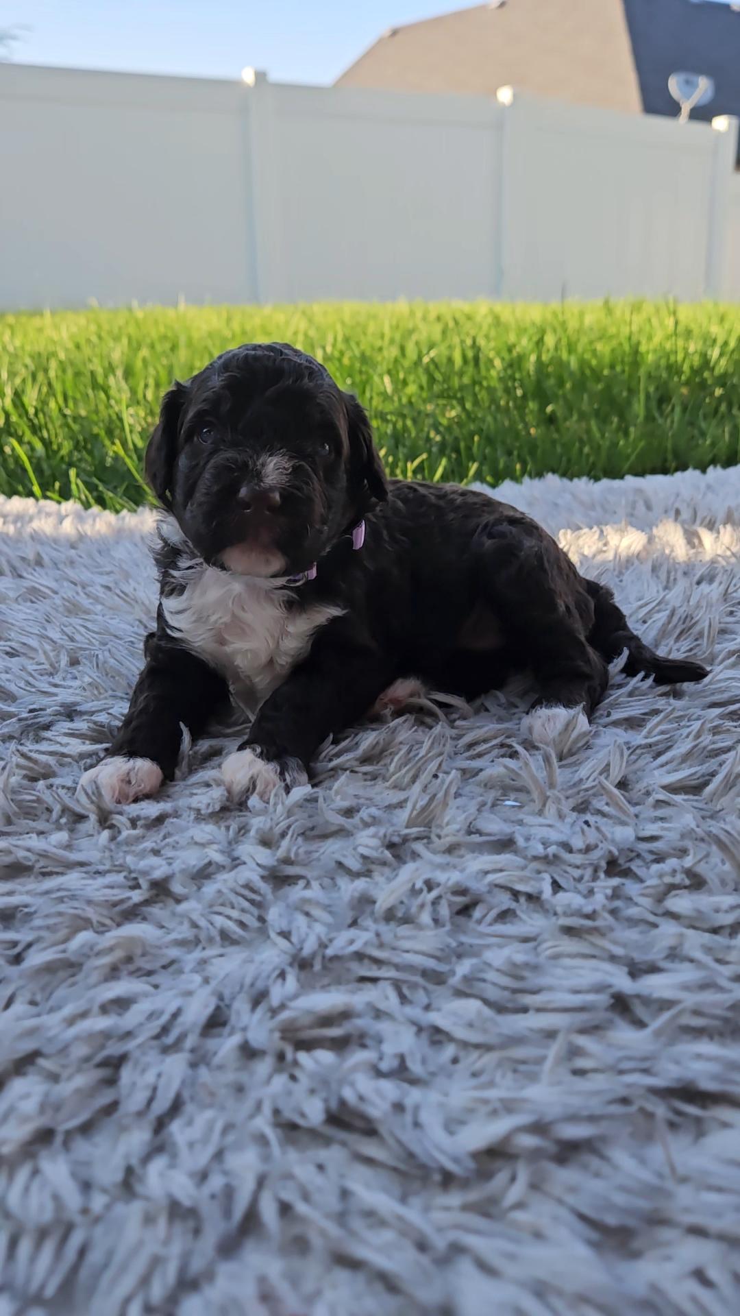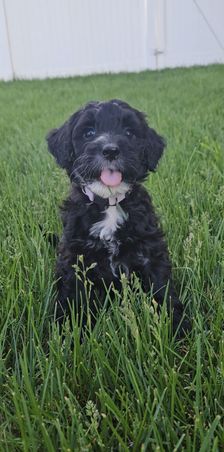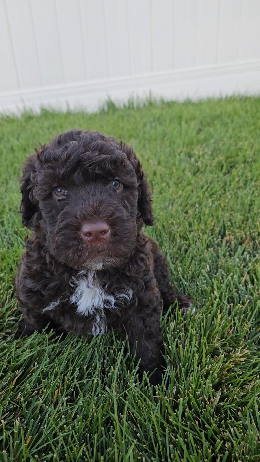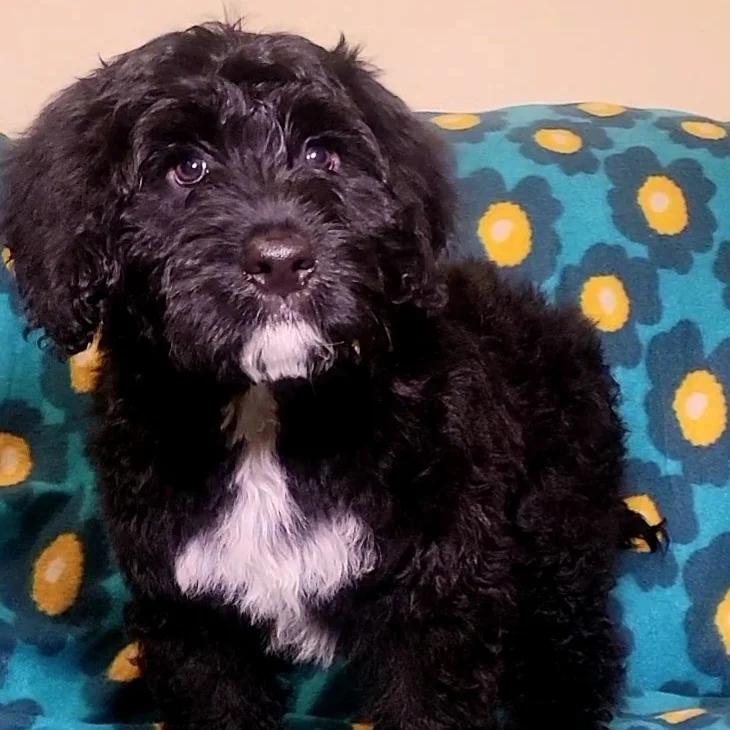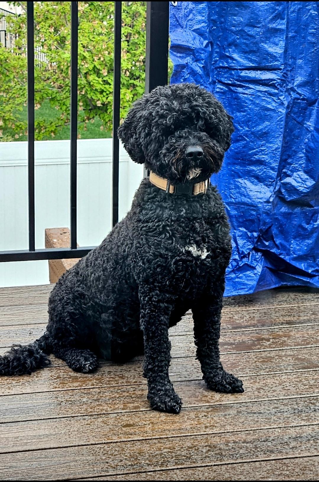 Samba is everything a Portuguese Water Dog should be- fun, happy go lucky, non agressive, and athletic. She is a true velcro dog and con be found glued to my side most of the time. She is intuitive and caring and always seems to be comforting someone. She loves to play at the lake and will swim with the kids all day. The only thing she loves more than swimming is riding on a kayak or paddle board. She is an excellent Mama and has produced the most amazing puppies. Her personality is seriously the best, and she spends her days playing with my kids ages 2-10. She is patient, loving, smart, and exceptionally loyal. She will take all the belly rubs you can give! She has beautiful Curly Black hair with small white markings.