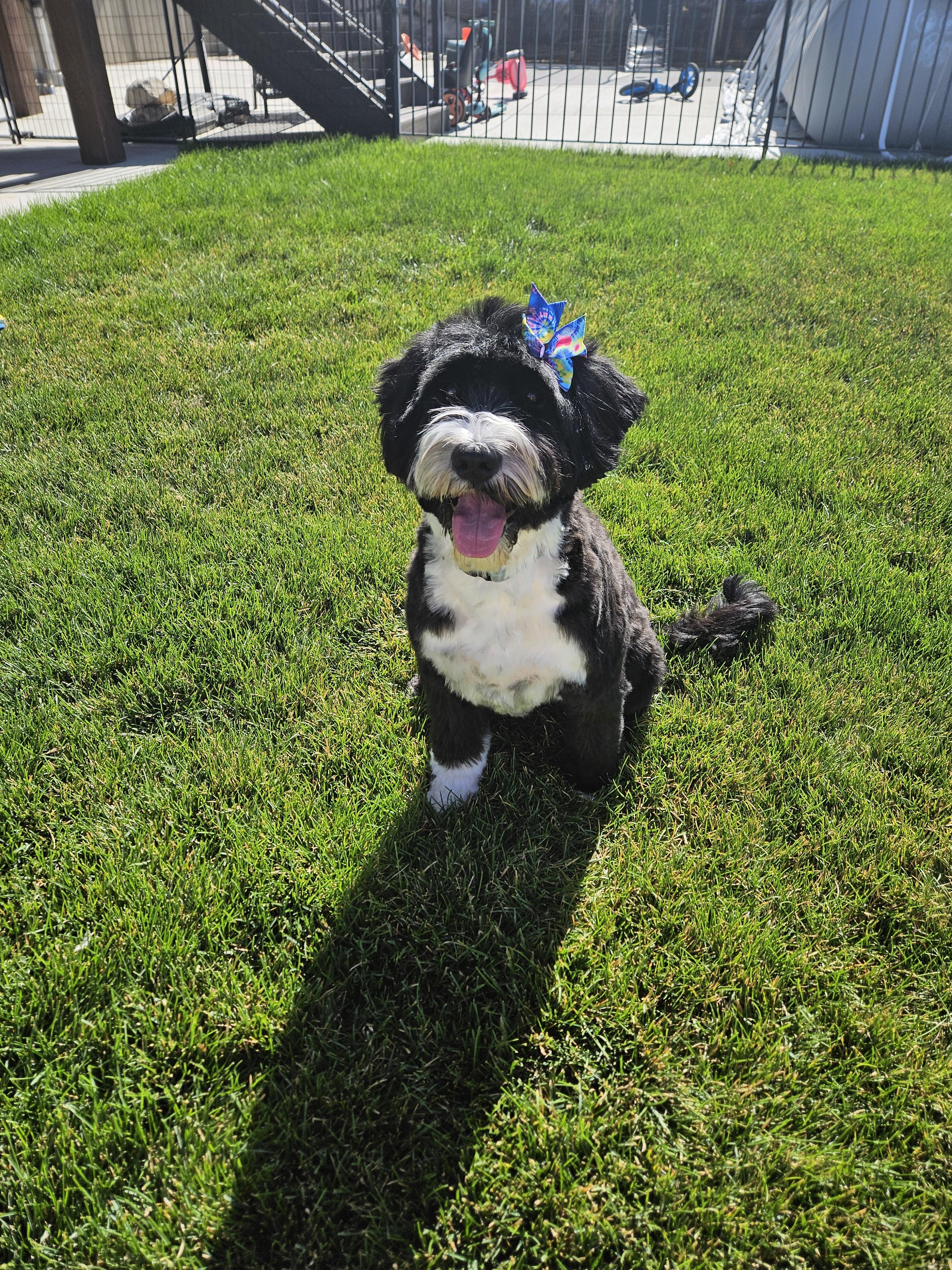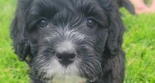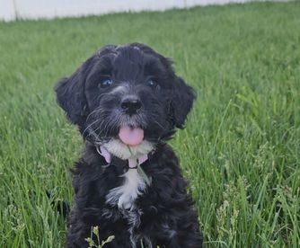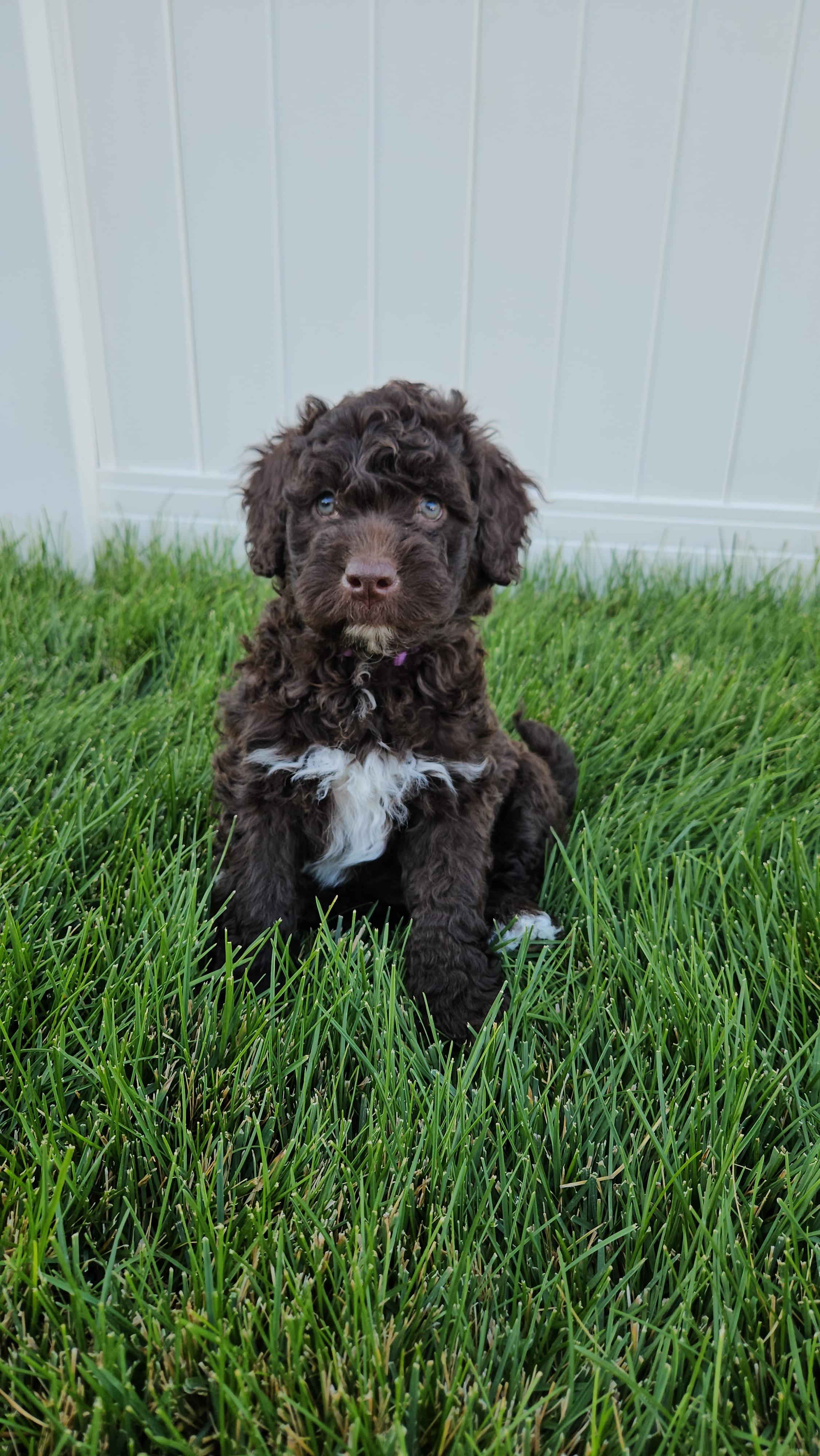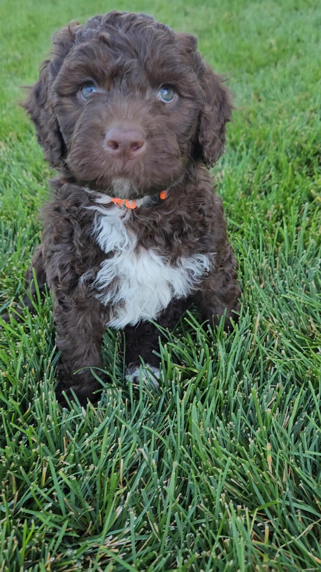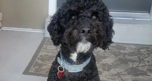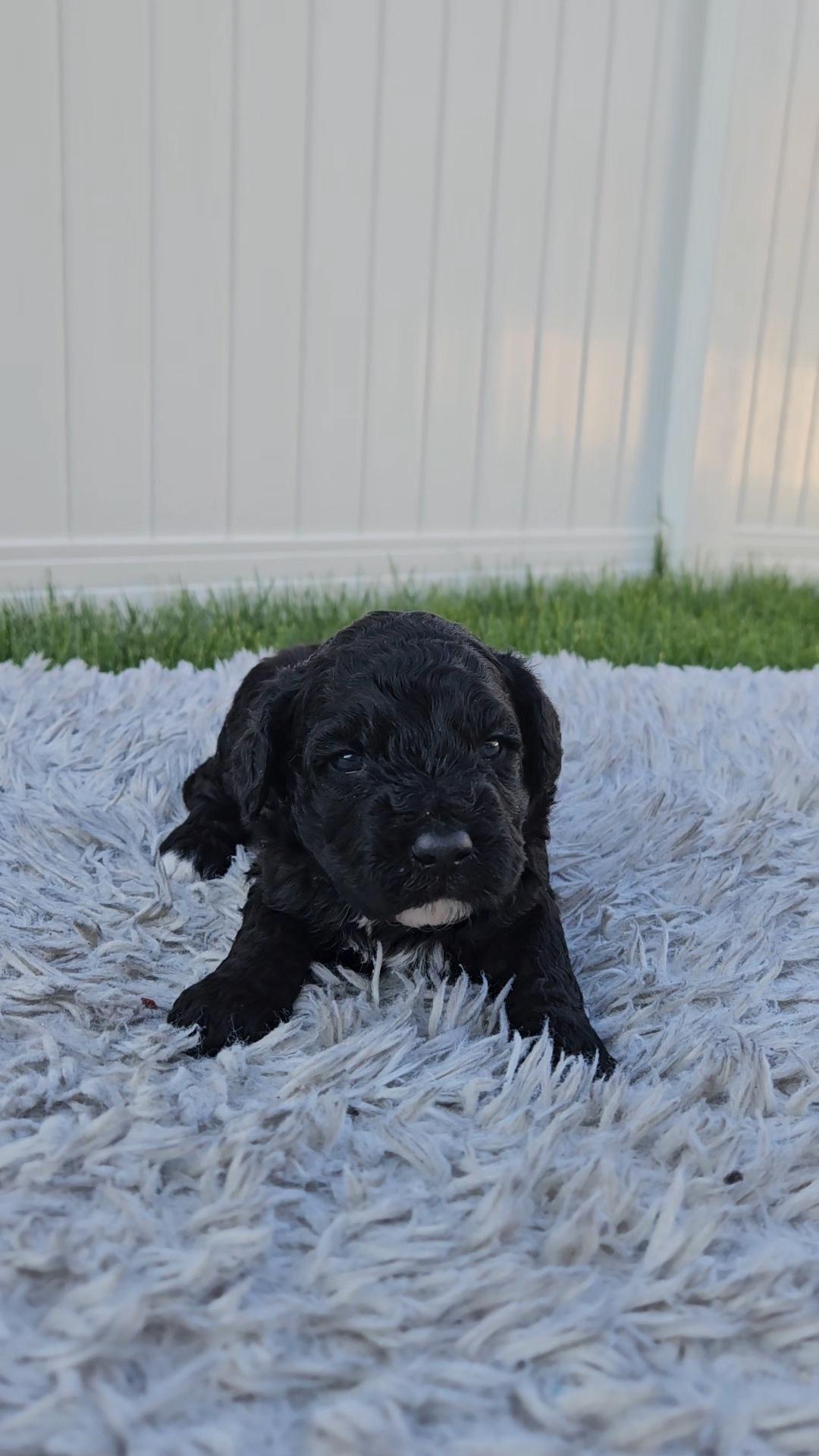 Samba is everything a Portuguese Water Dog should be- fun, happy go lucky, non agressive, and athletic. She is a true velcro dog and con be found glued to my side most of the time. She is intuitive and caring and always seems to be comforting someone. She loves to play at the lake and will swim with the kids all day. The only thing she loves more than swimming is riding on a kayak or paddle board. She is an excellent Mama and has produced the most amazing puppies. Her personality is seriously the best, and she spends her days playing with my kids ages 2-10. She is patient, loving, smart, and exceptionally loyal. She will take all the belly rubs you can give! She has beautiful Curly Black hair with small white markings.