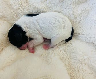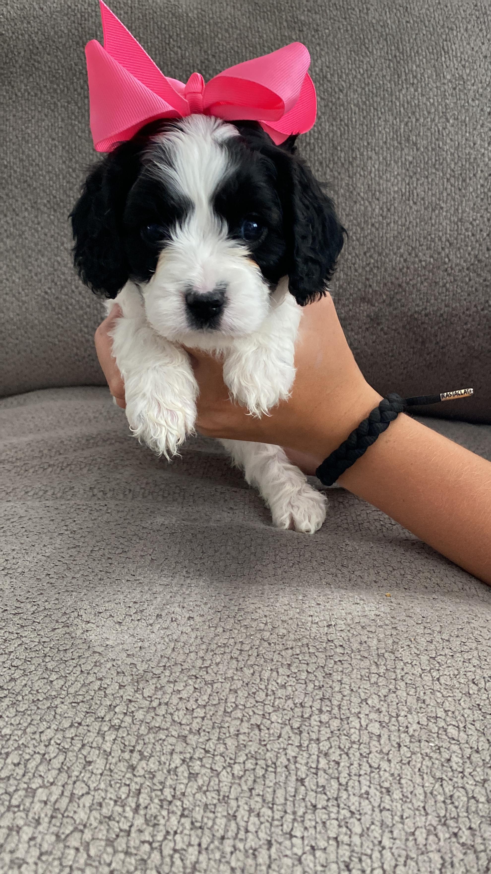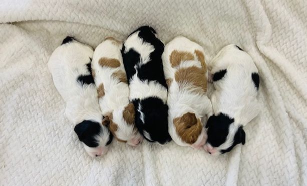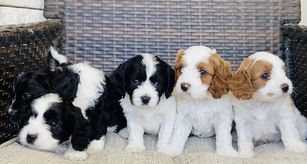 Our Cavapoo puppies include tri-color, blenheim, and black and white. Colors will vary depending on the parent dogs.