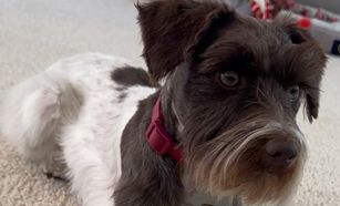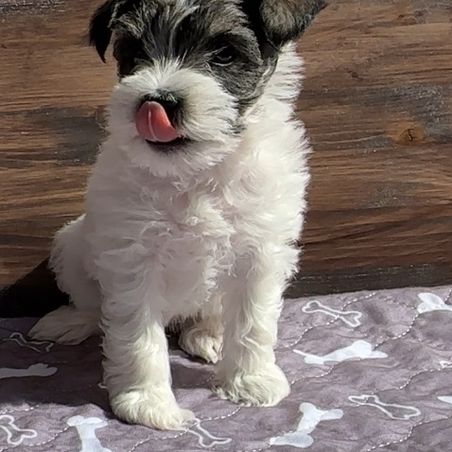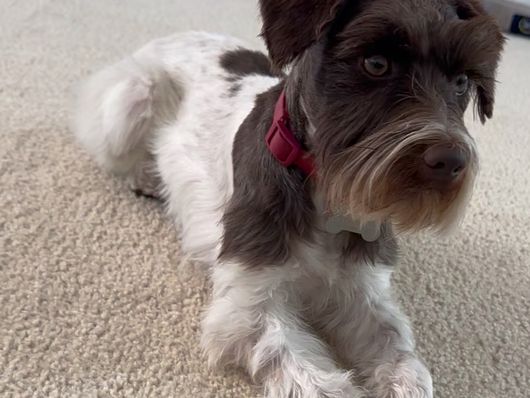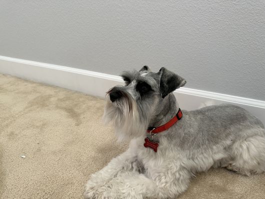 Bruno is a Mega coat Mini Schnauzer , Fun loving, great with people, loves to cuddle. loves being outside, is a runner and workout a lot and he loves to workout with me. Bruno weighs 13lbs, he is a Parti miniature schnauzer.