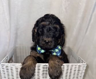 Our Aussiedoodle puppies include brown and white and black and white. Goldendoodle puppies include cream, apricot, red, chocolate, black, phantom, and parti. Poodle puppies include apricot, black, brown, cream, white, and parti. Bernedoodle puppies include brown, black, black and white, tri-color, and phantom. Colors will vary depending on the parent dogs.