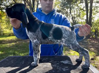 Our puppies include liver roan, white and liver, liver and white, liver, black roan, black and white, and black. Colors will vary depending on the parent dogs.