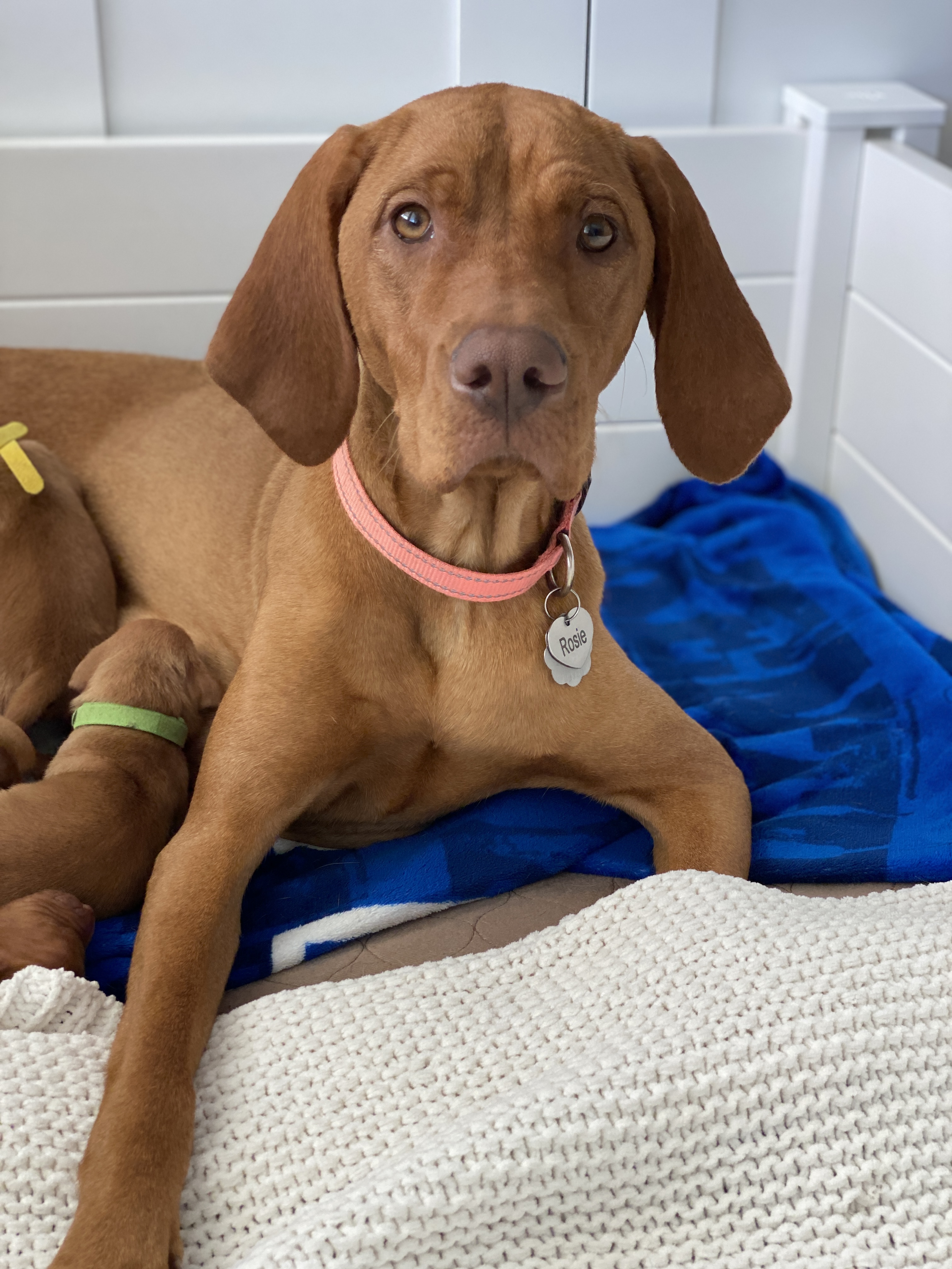 Rosie is a female Vizsla. Carefully selected as a great representative of her breed, Janessa decided to make her part of their program. Janessa has passed Good Dog’s screening process, which involved a review of their breeding practices, environment, and the mental and physical health of their dogs.