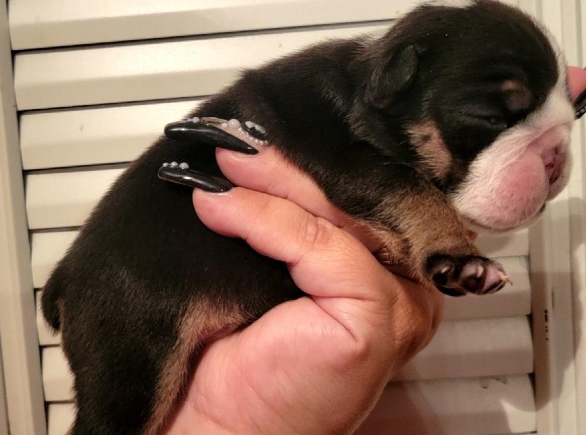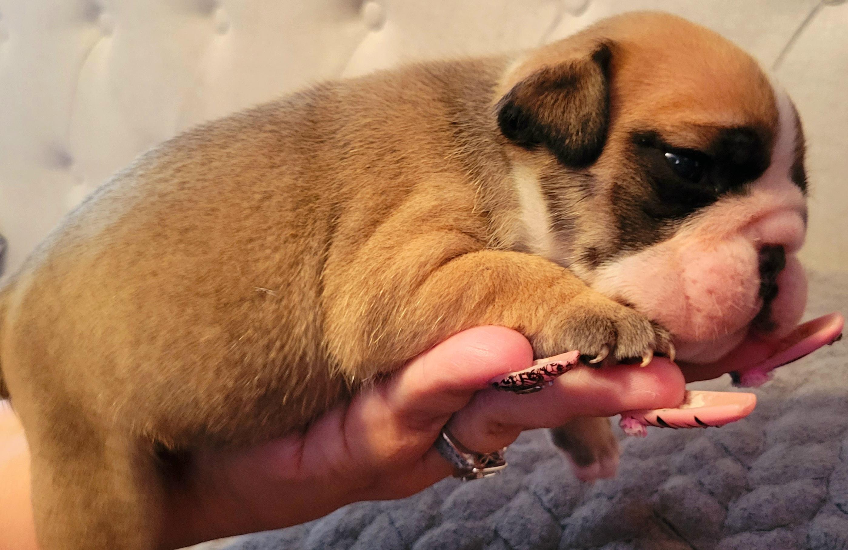 Etta is a female Bulldog. Carefully selected as a great representative of her breed, Heather decided to make her part of their program. Heather has passed Good Dog’s screening process, which involved a review of their breeding practices, environment, and the mental and physical health of their dogs.