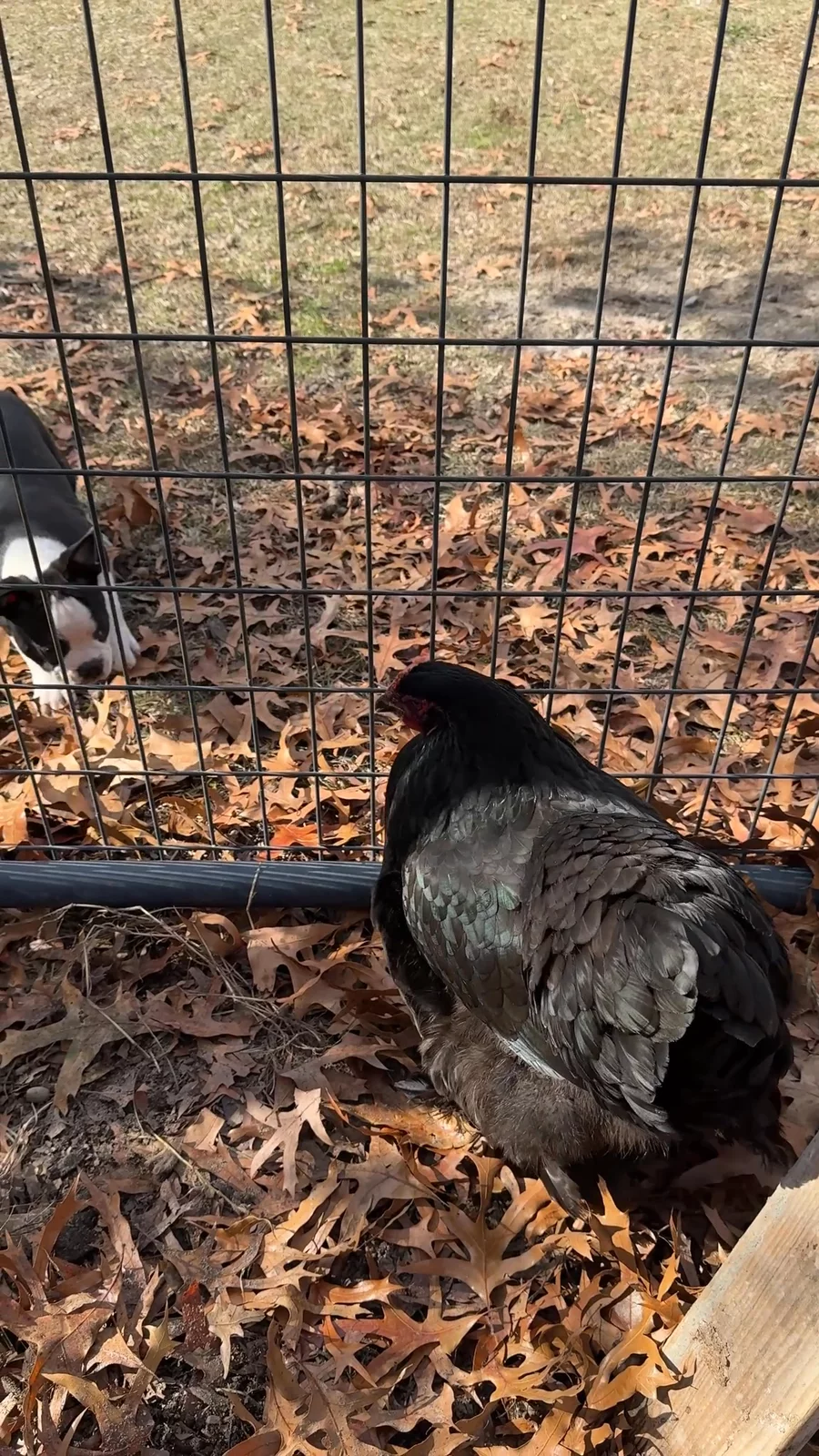 Making a hen friend… it’s important to socialize and introduce puppies to new sounds, people, car rides, nail trims, etc as well as other pets. My puppies are safely introduced to our feather friends early on. This is a great way for me to learn who has high prey drive and who could care less so I can further introduction and allow them to learn these live chickens are our friends and to be gentle with them. This can be helpful in making sure families bring home a puppy that is the best fit for them and their other furry or feathered friends. Although Freddy is barking at this hen from one side of the fence he’s totally cool when he’s on the same side as her, but does like to sometimes play a good game of “Tag! You’re it!” with them, which the hens usually instigate and this is perhaps the reason he is so excited to see her. Hannibal and Pugsly are curious but not as interested in playing with her the way Freddy is.