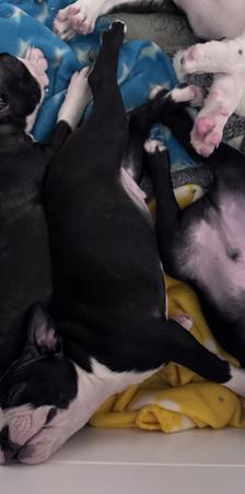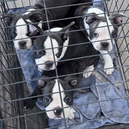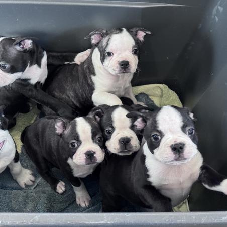 These bouncy baby Bostons went to the vet on Tuesday for their first round of puppy shots and all got a clean bill of health. Good patellas, hearts, eyes, etc. and all have been dewormed and started on monthly NexGard. 5 out of 6 are still searching for their furever homes and are ready to go now.