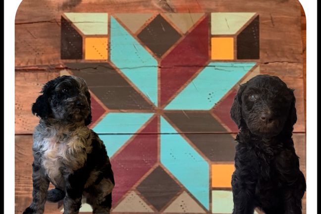Our Aussiedoodle puppies include black and white and black tri-color. Poodle puppies include black, blue, and brown. Miniature Australian Shepherd puppies include blue merle, black tri, and red tri. Colors will vary depending on the parent dogs.