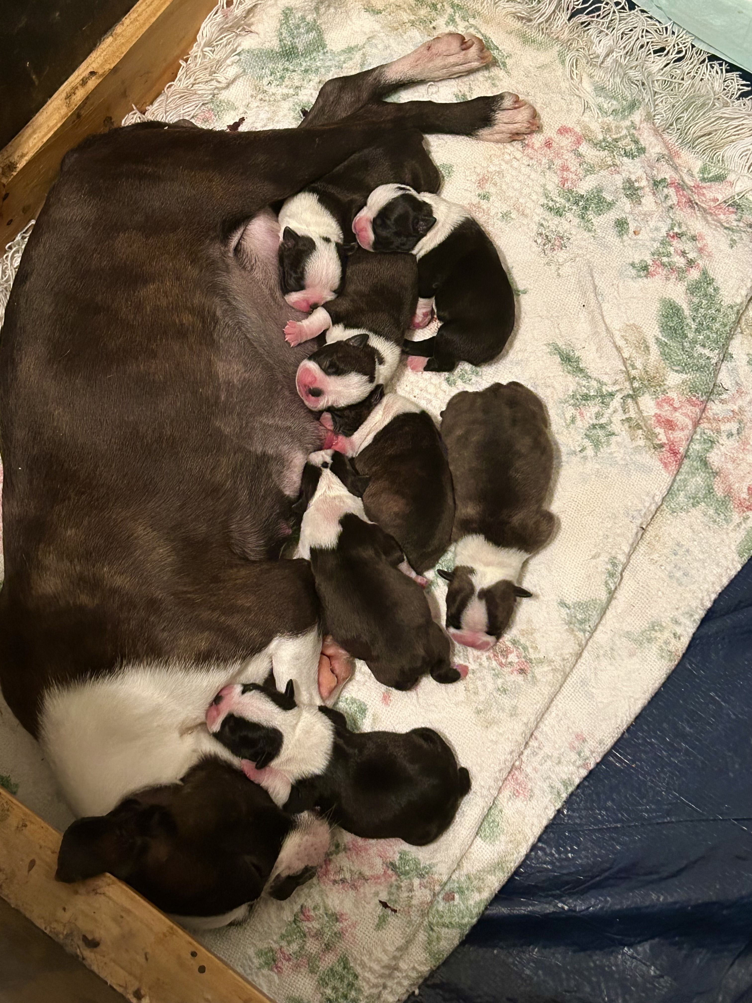 Our puppies include brindle and white, black brindle and white, and black and white. Colors will vary depending on the parent dogs.