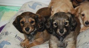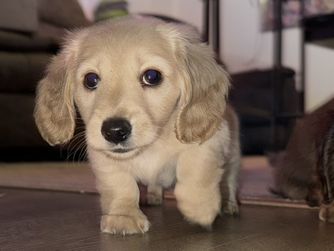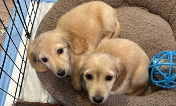 “The rehoming fee is for an AKC long haired mini Dachshund . Puppies are an shaded cream When Puppies are 8 weeks old and ready to go. They have had their first rounds of valentines and deworming done. They will have veterinarian visit prior to going to their furever homes.”