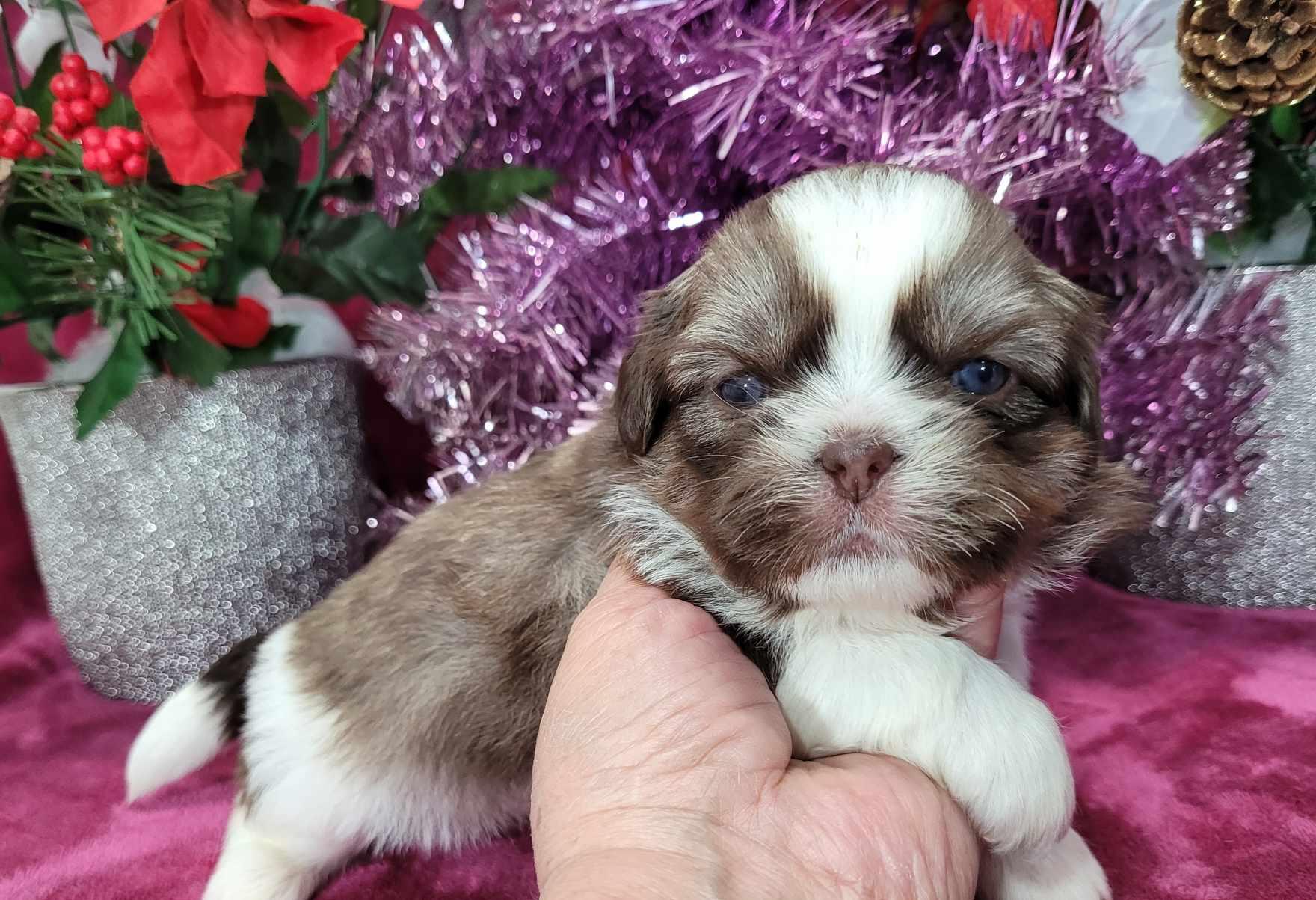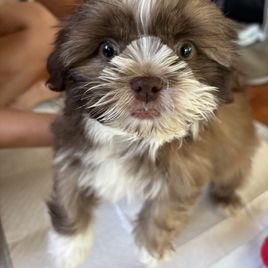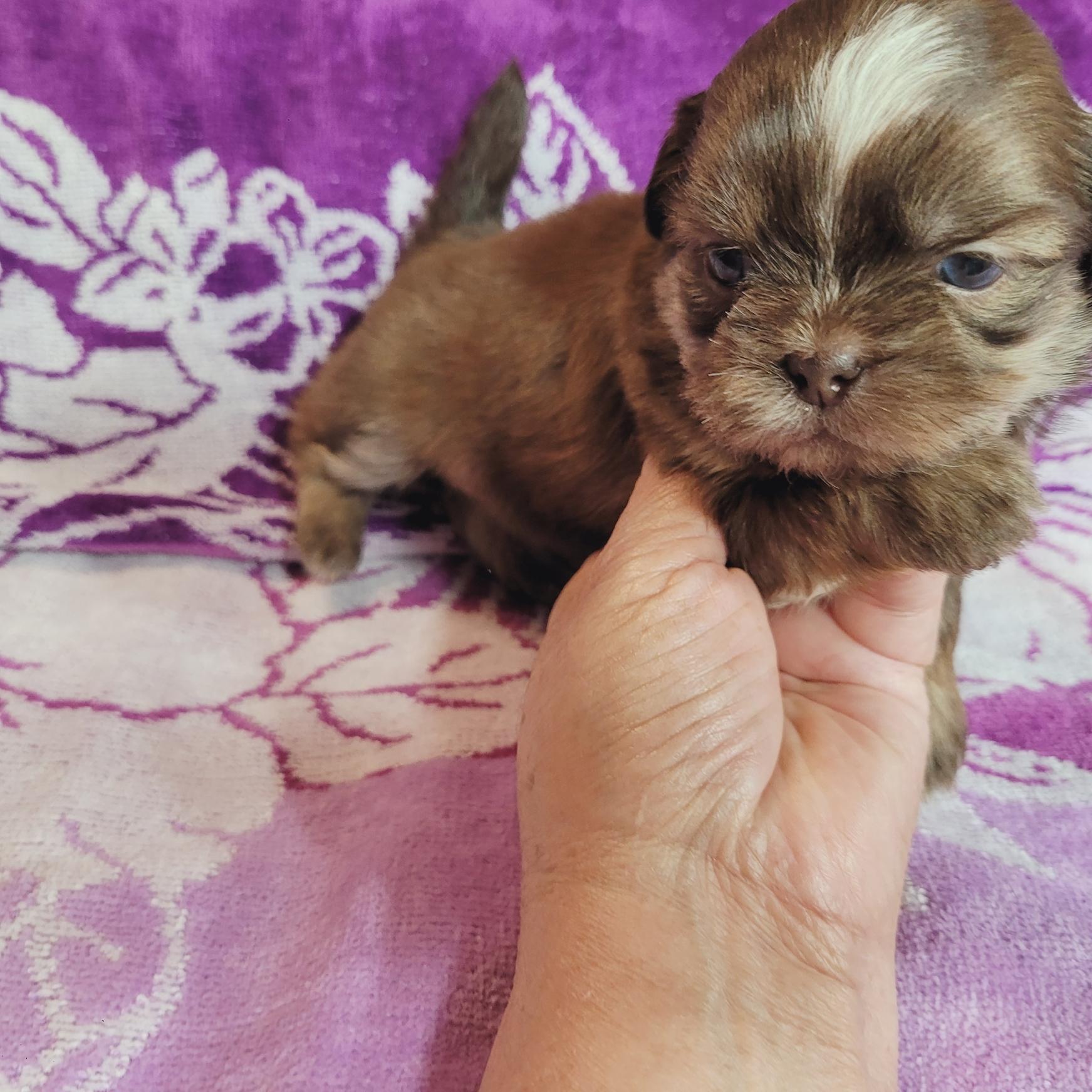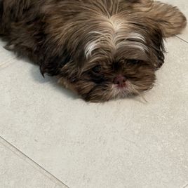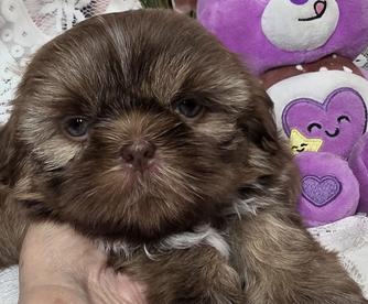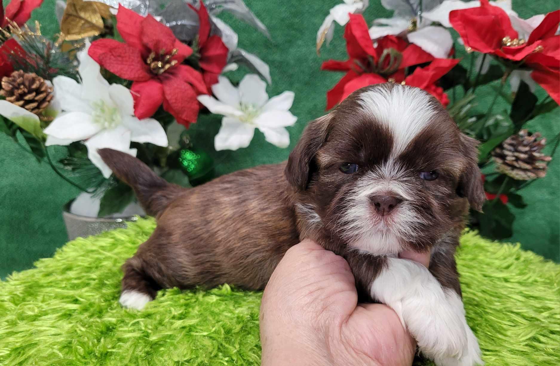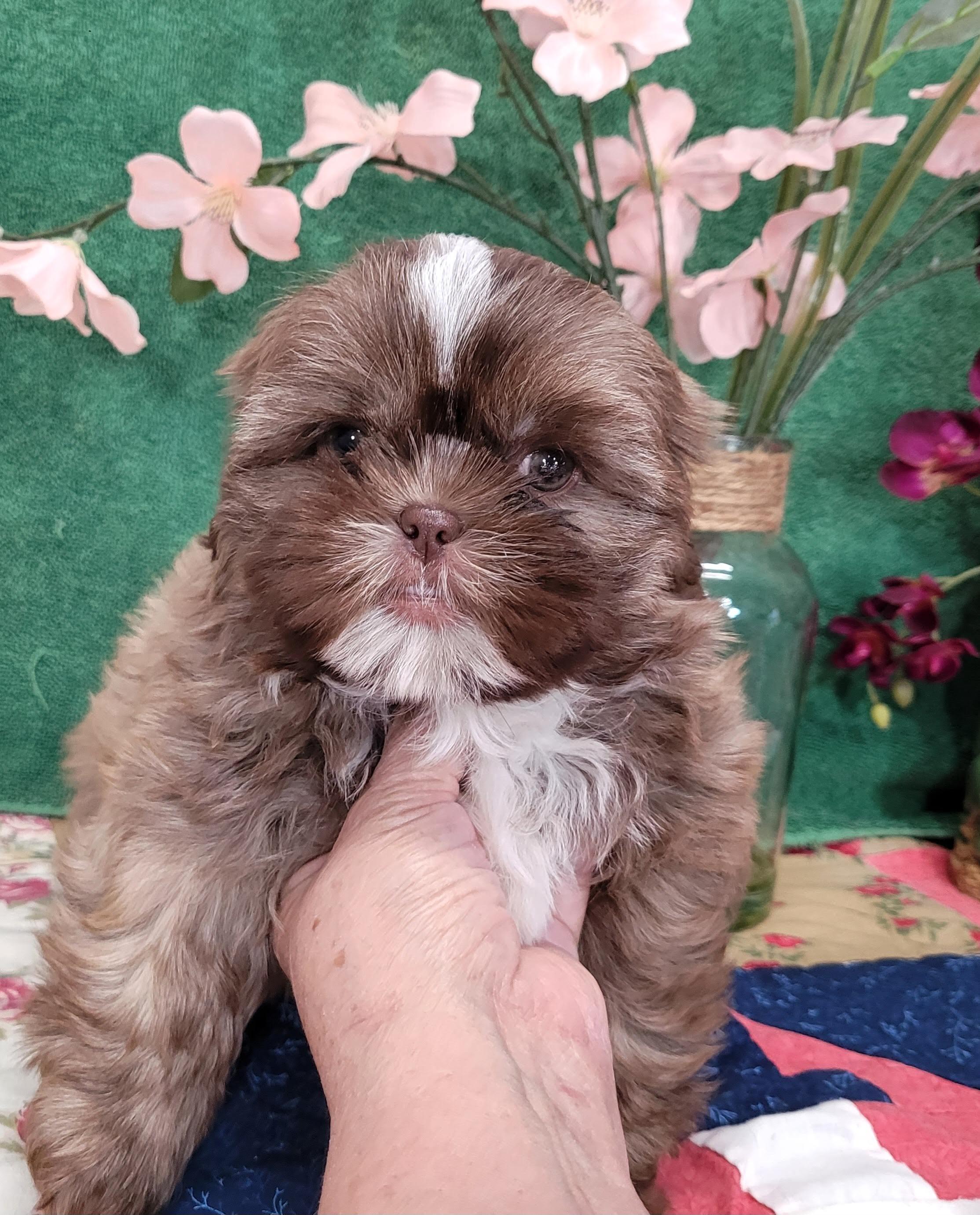 Twinkle is a beautiful Liver female Shih Tzu. Her face and body are white with brown ears. Twinkle is a great mama. She has never had health problems. She loves attention and loves to snuggle.