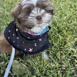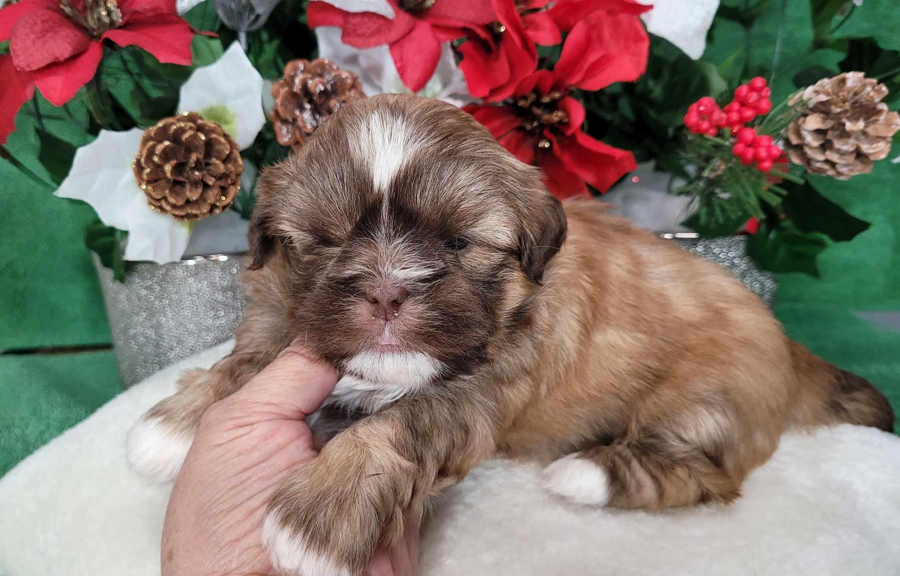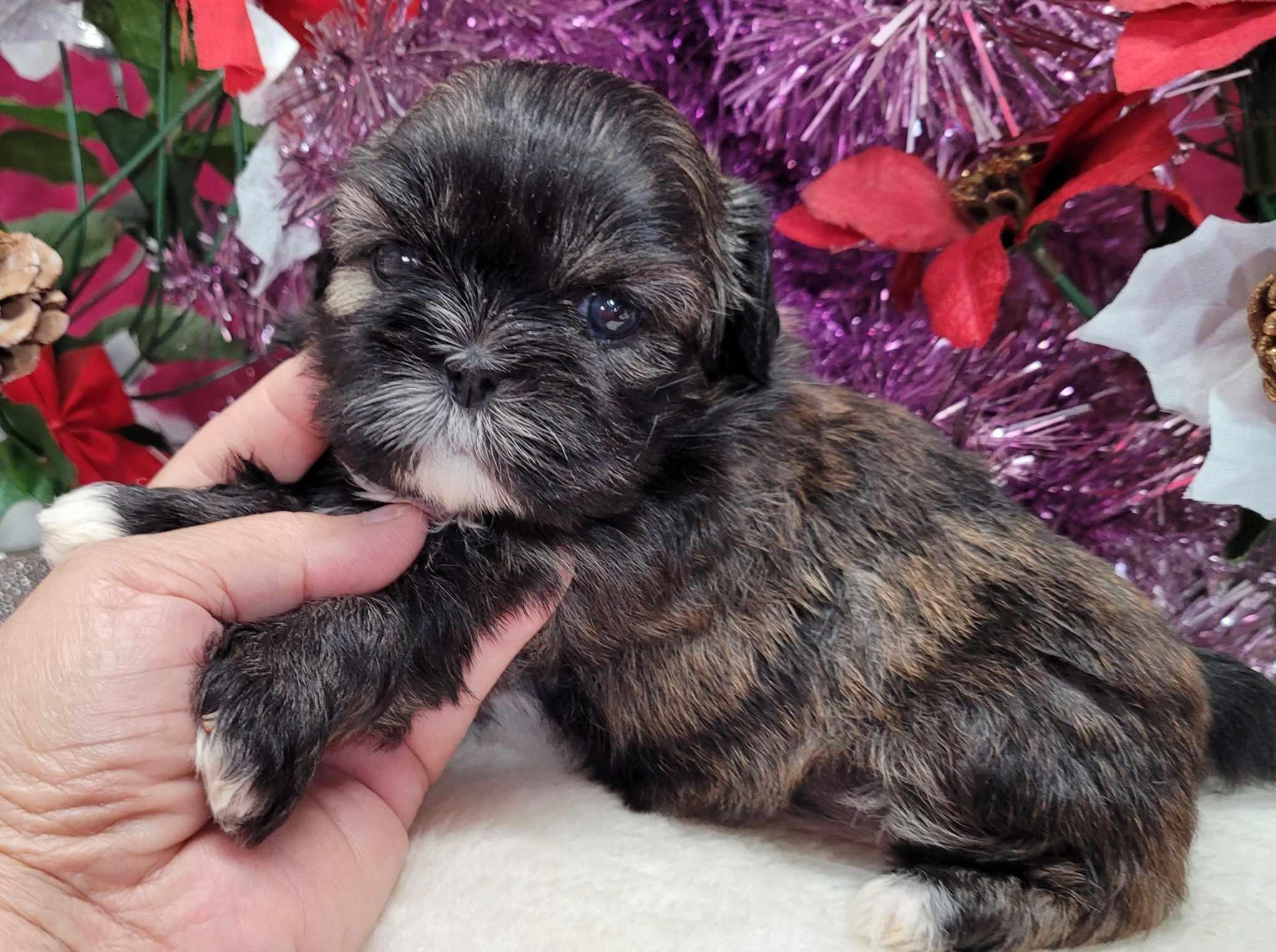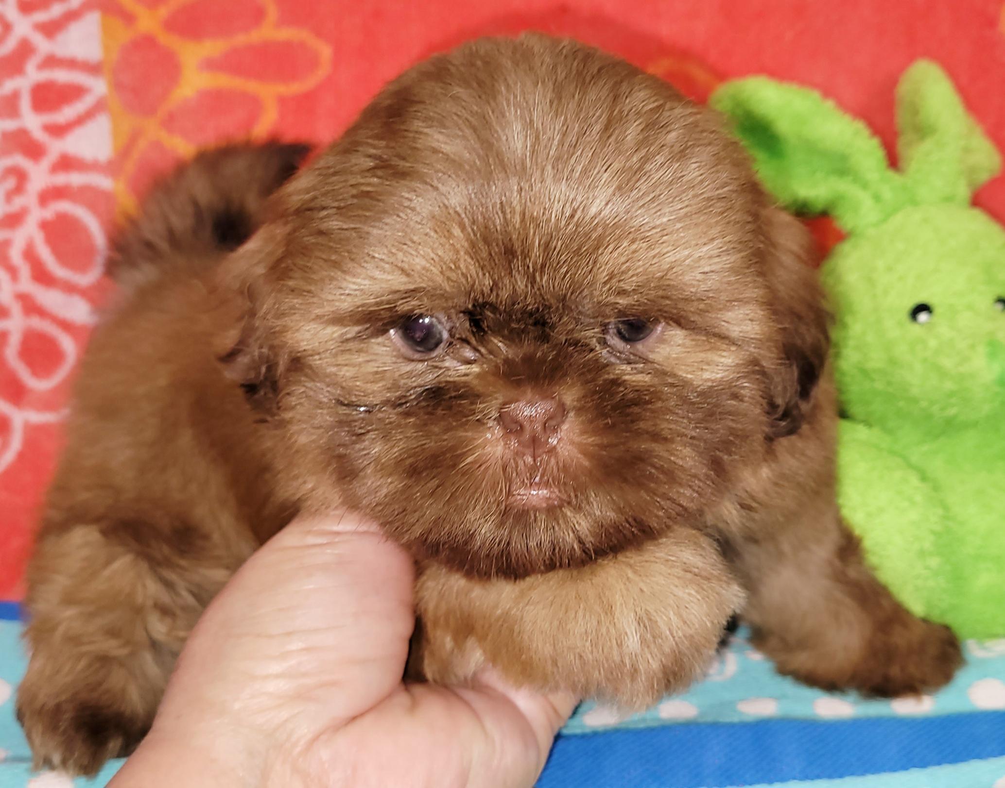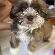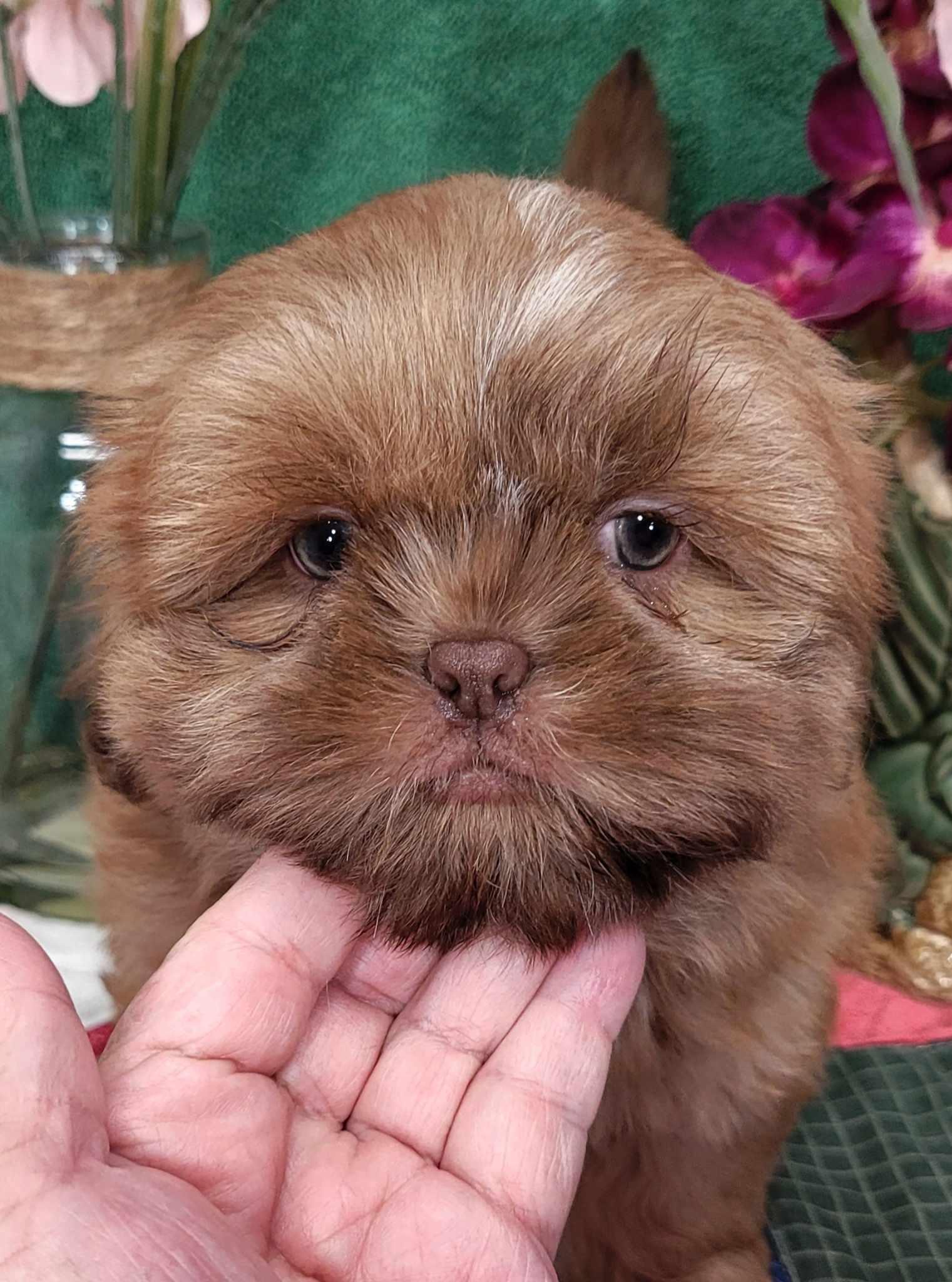 Twinkle is a beautiful Liver female Shih Tzu. Her face and body are white with brown ears. Twinkle is a great mama. She has never had health problems. She loves attention and loves to snuggle.