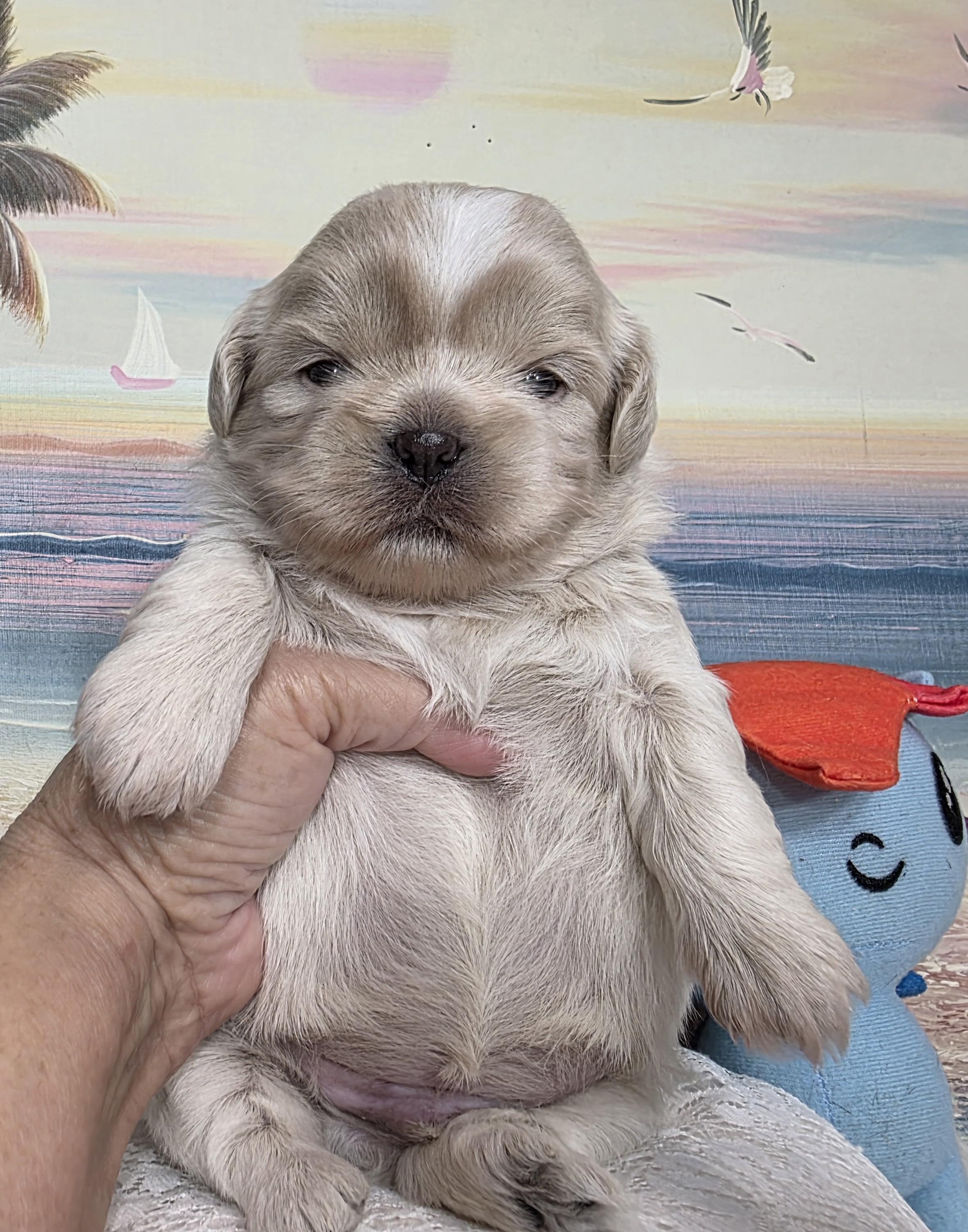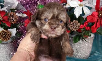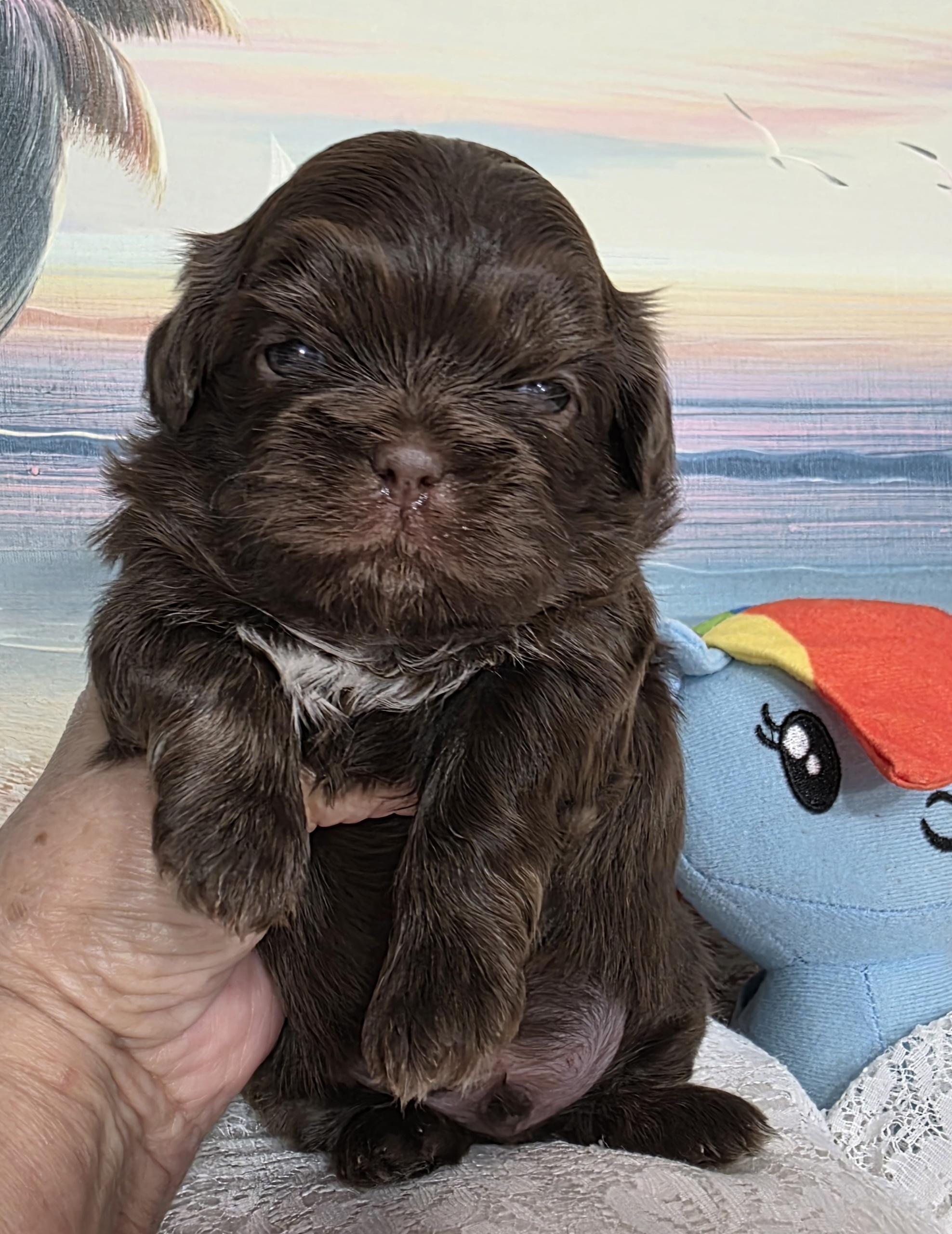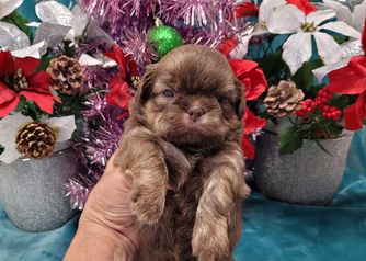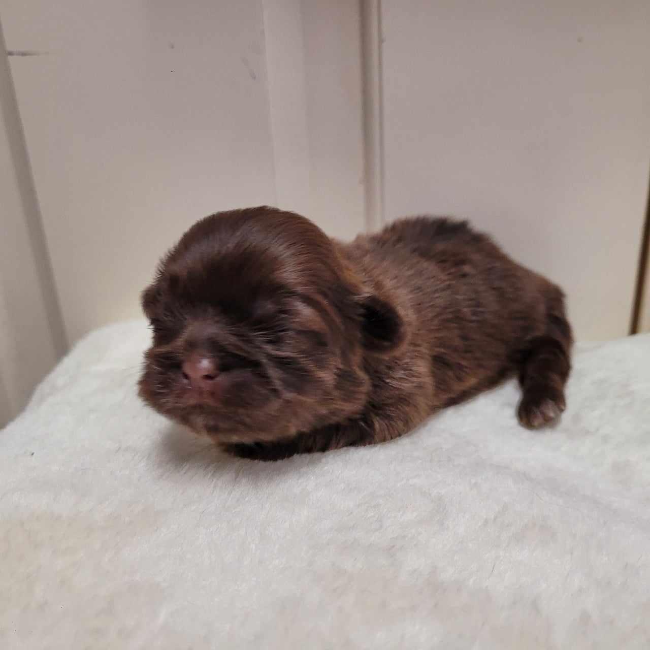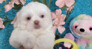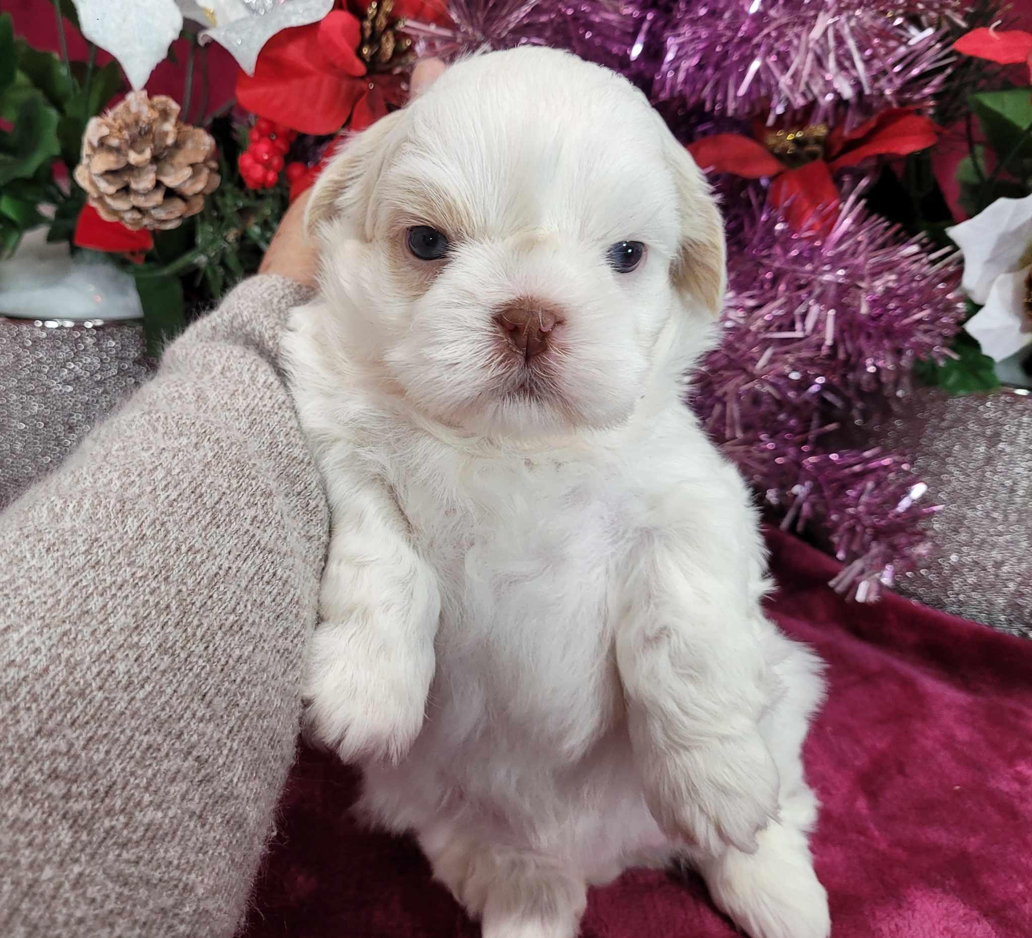 Twinkle is a beautiful Liver female Shih Tzu. Her face and body are white with brown ears. Twinkle is a great mama. She has never had health problems. She loves attention and loves to snuggle.