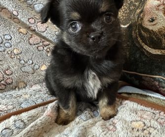 This elegant black Chihuahua dam is the epitome of grace in a tiny package. Her sleek, jet-black coat shines with a glossy finish, hugging her petite frame like velvet. With soulful dark eyes that radiate intelligence and devotion, she watches the world with quiet confidence.