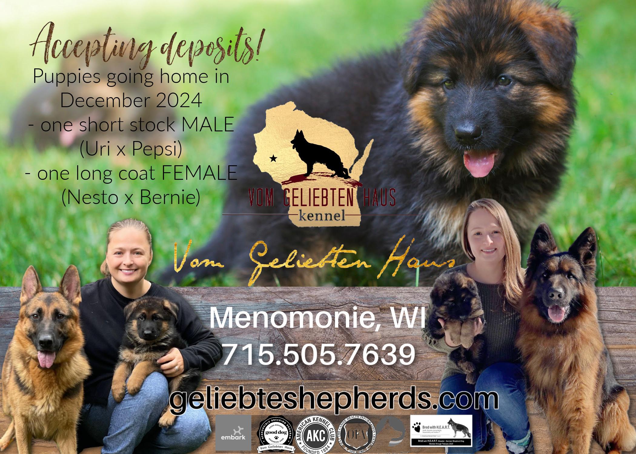 I'm Veronika Z., the breeder behind Vom Geliebten Haus located in Menomonie, WI. We are dedicated German Shepherd Dog owners, trainers and breeders, a husband and wife - Serge and Veronika. We breed for the love of the animals and because we see a huge need to improve the quality of existing population of German Shepherd Dogs here in the Midwest.