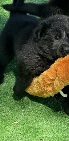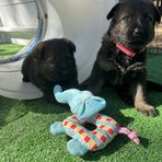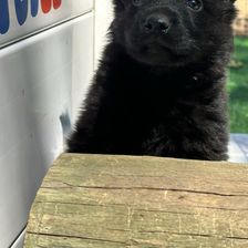 This gorgeous black sable female puppy is really starting to show her personality. She’s a very confident puppy who isn’t afraid to try new things but when called comes immediately for hugs and kisses. She’s is environmental stable on many different surfaces, has no noise sensitivity, and showing a desire to chase a ball and play tug o war.