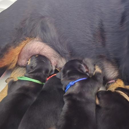 Our puppies include black and mahogany and black and rust. Colors will vary depending on the parent dogs.