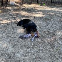 Valkyrie is doing great she can come, sit, down, stand and settle which is a down with head on paws if she gets tooo excited during playtime. She is working on twirl, twist, paws up, leave it and place. The picture is a nice chew time after training!