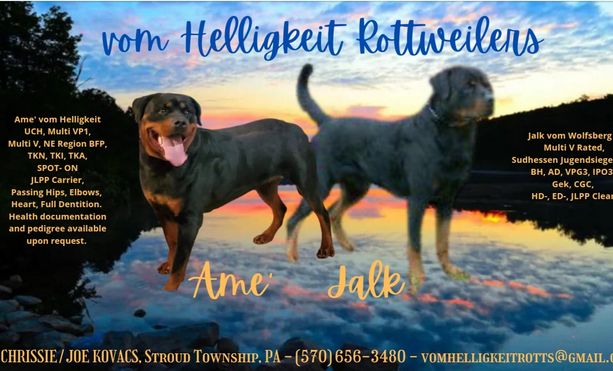 I'm Christina K., the breeder behind vom Helligkeit located in Stroud Township, PA. We have been involved qith Rottweilers for 25+ years through showing, training and work. We follow the Code of Ethics set by our Parent Club. We do prefer calls for inquiries.