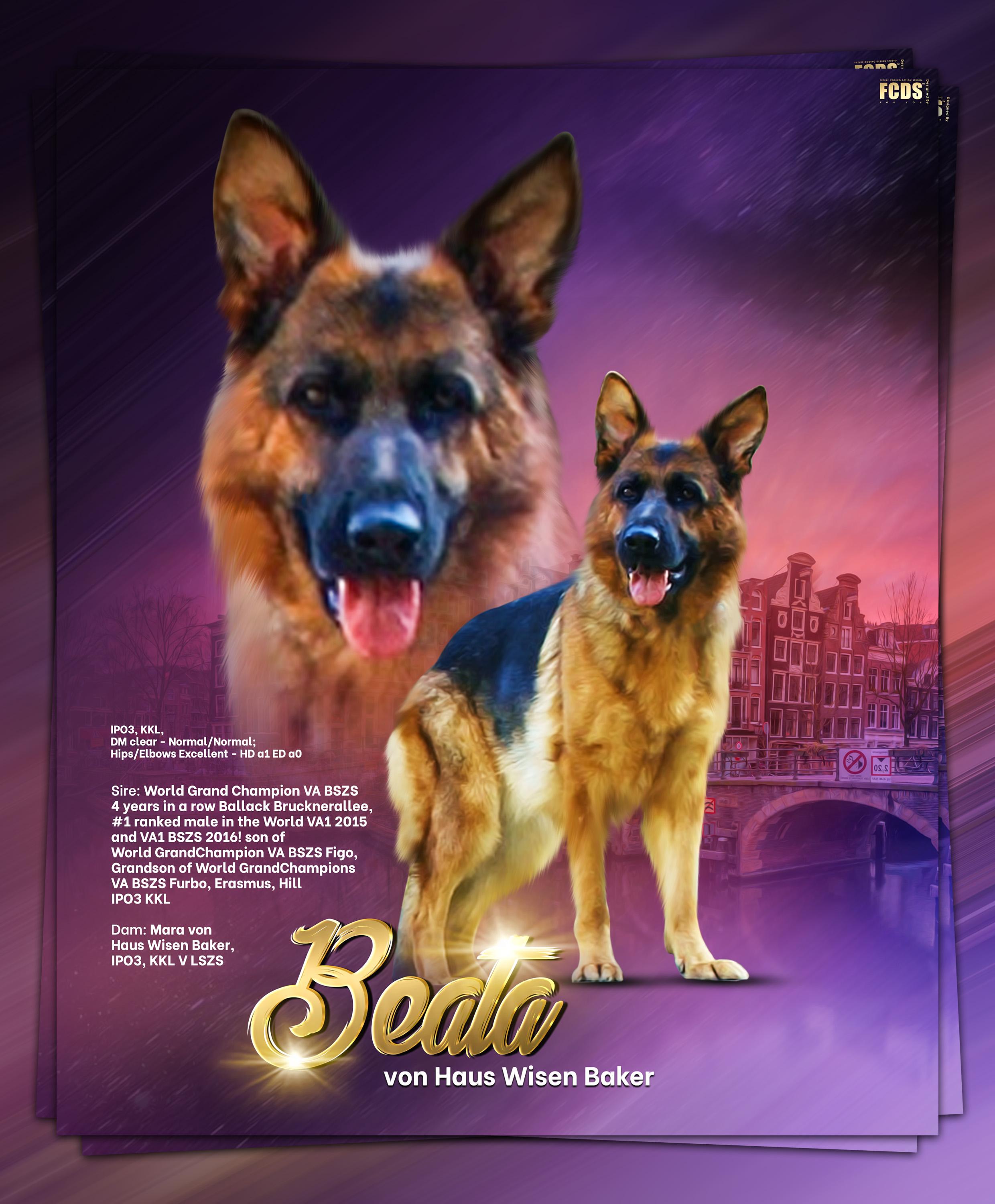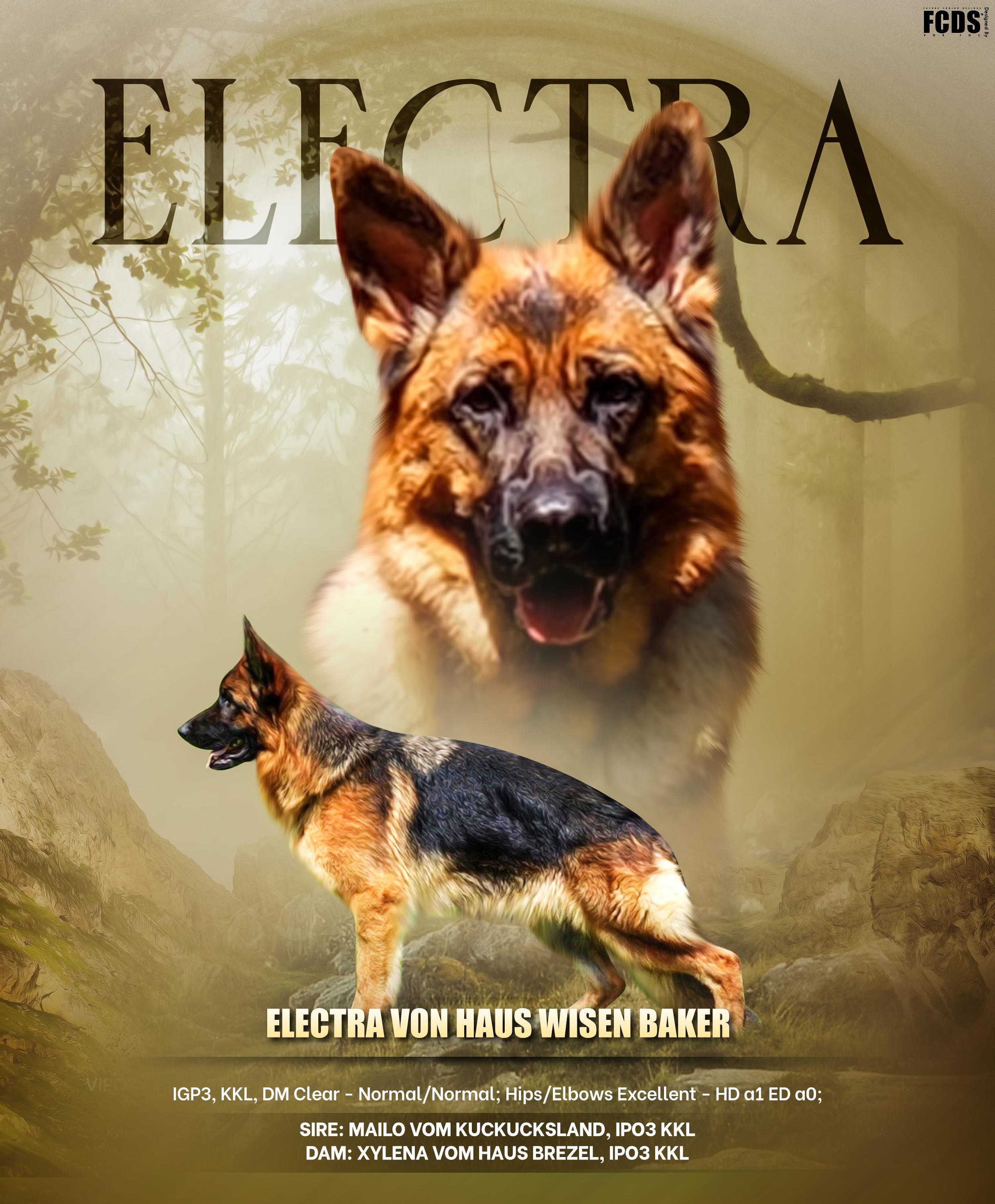 Highest level working title IGP3, breed survey KKL, Champion CACIB Best in Show, hips/elbows excellent, DM OFA clear