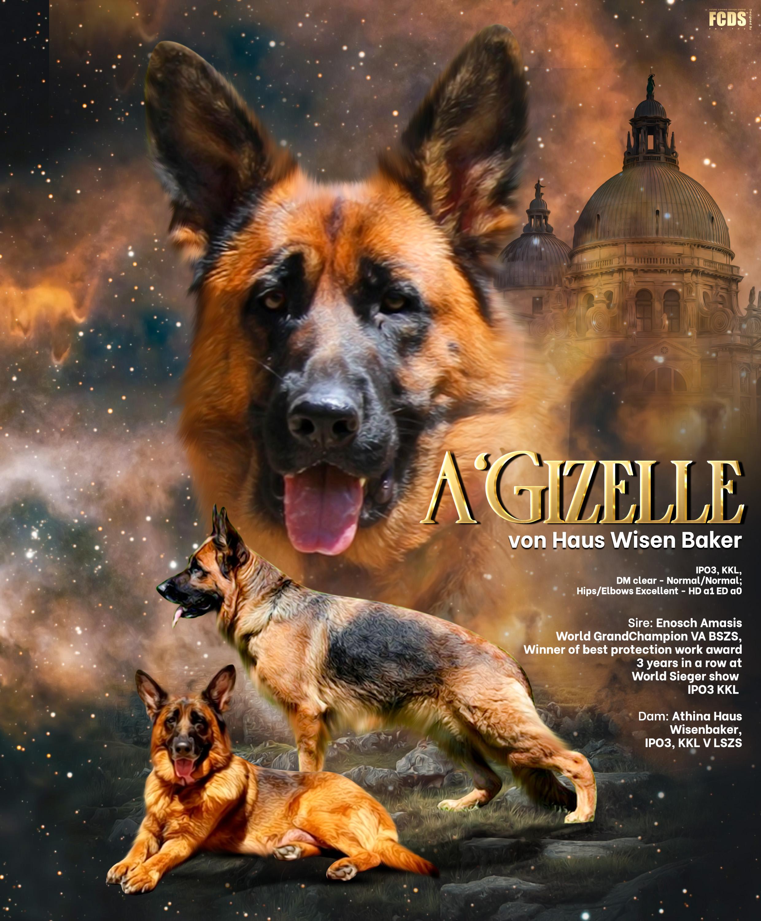 Gizelle is a female German Shepherd. Carefully selected as a great representative of her breed, Alena decided to make her part of their program. Alena has passed Good Dog’s screening process, which involved a review of their breeding practices, environment, and the mental and physical health of their dogs.