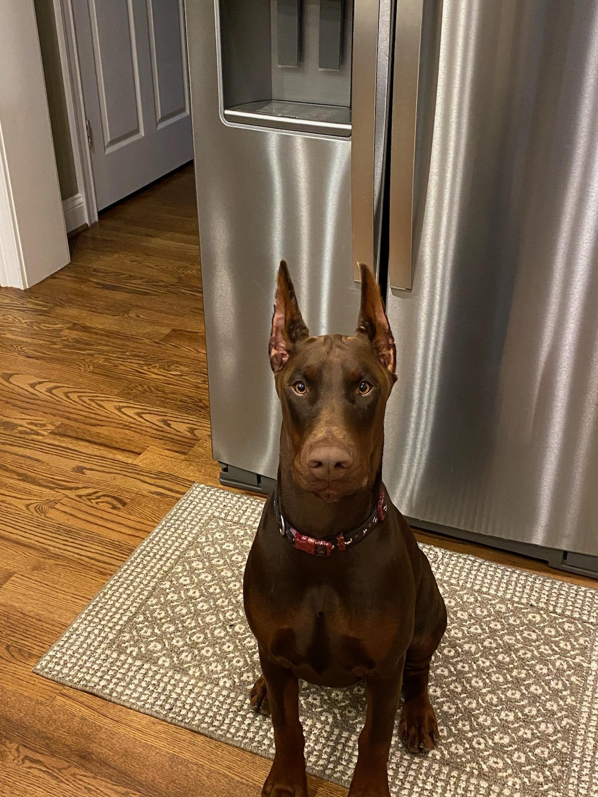 Rino is a female Doberman Pinscher. Carefully selected as a great representative of her breed, Christy decided to make her part of their program. Christy has passed Good Dog’s screening process, which involved a review of their breeding practices, environment, and the mental and physical health of their dogs.