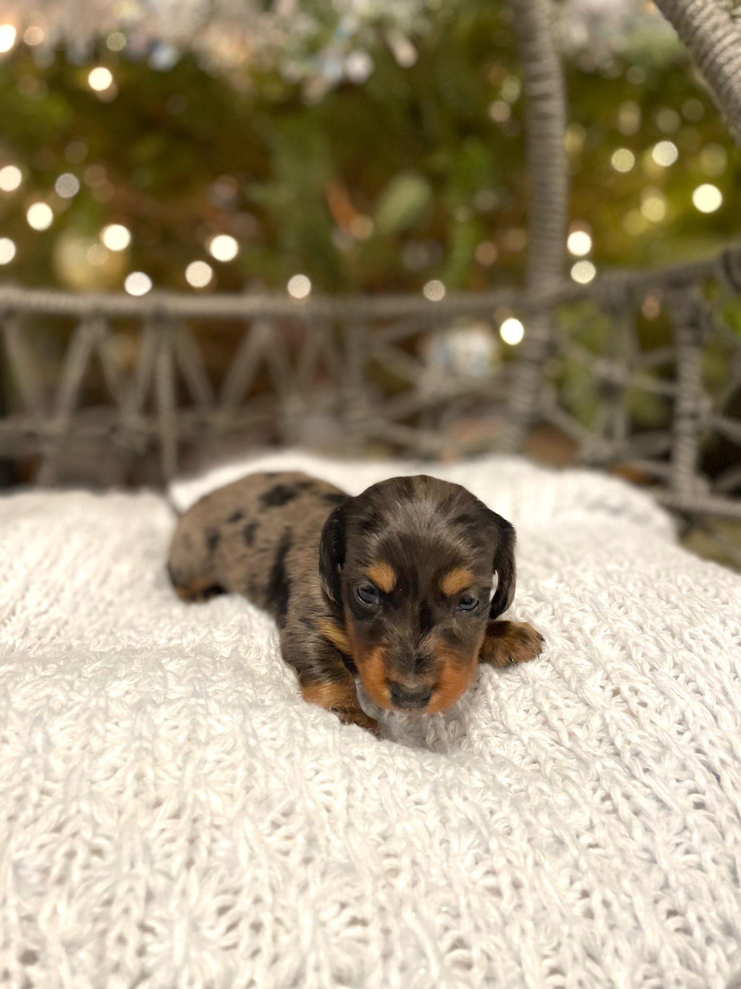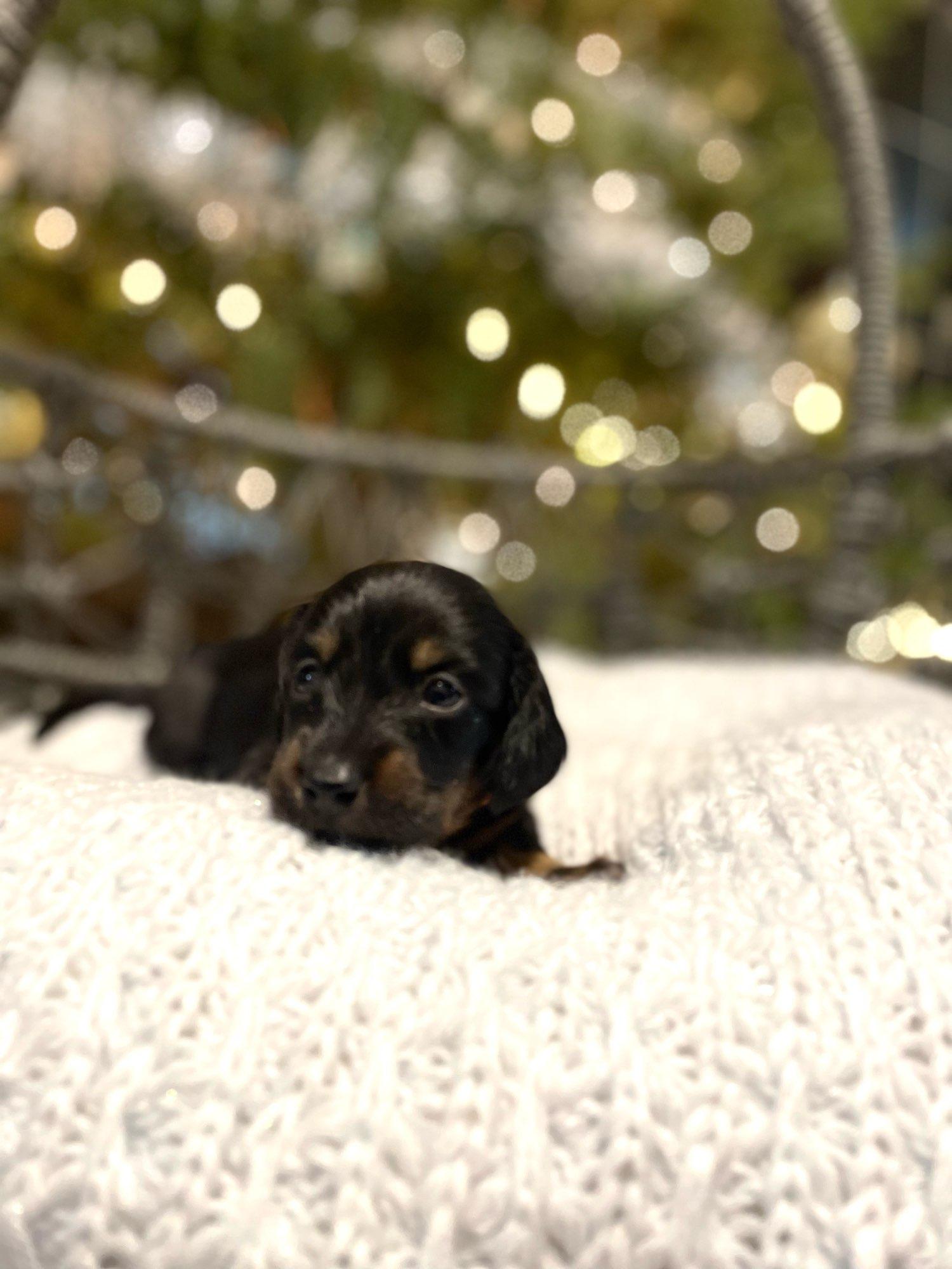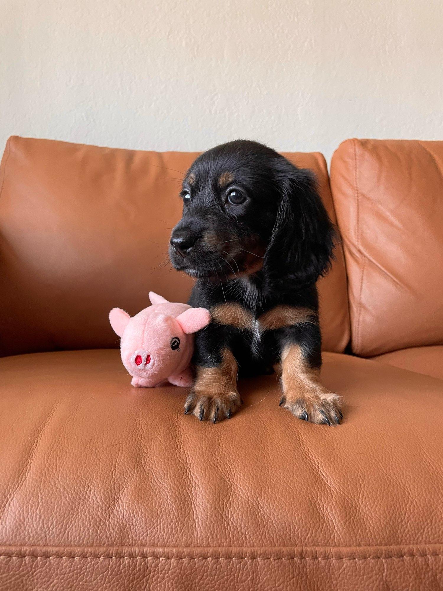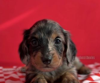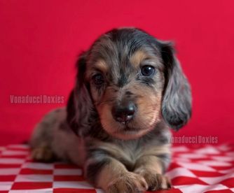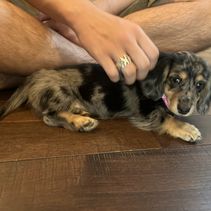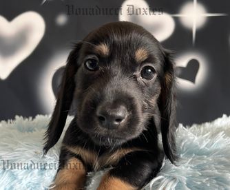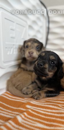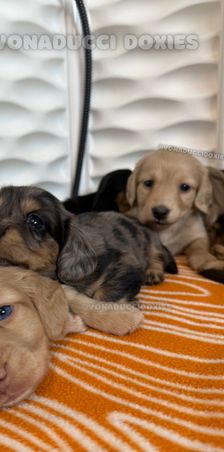 We had such a great experience with Vonaducci Doxies! From the very beginning, she shared weekly photos and milestone updates of our newest edition to the family, Reece, which made the wait so exciting and special. You can truly tell how much love and care she puts into her dogs. Reece came to us happy, healthy, and already showing how smart she is! She’s fetching toys, learning potty training quickly, and has the sweetest personality. We drove 6 hours from New Mexico to Phoenix to bring her home, and we would do it all over again without hesitation. So grateful for the love and dedication that went into raising Reece before she came to us.