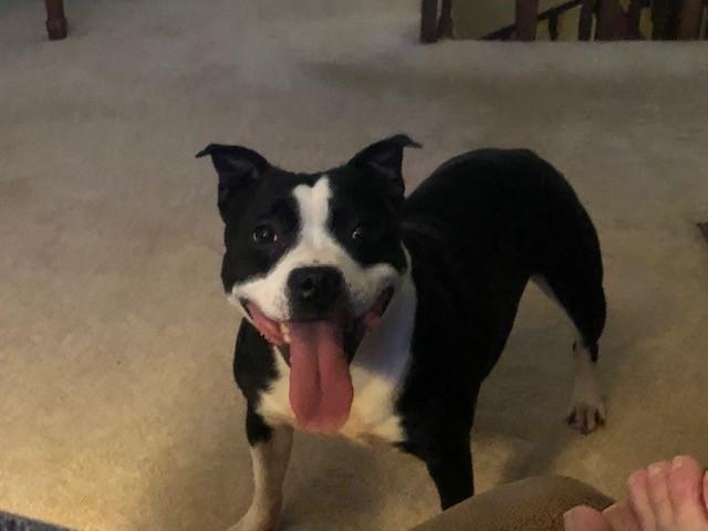 Maddie is a female Staffordshire Bull Terrier. Carefully selected as a great representative of her breed, Angela decided to make her part of their program. Angela has passed Good Dog’s screening process, which involved a review of their breeding practices, environment, and the mental and physical health of their dogs.