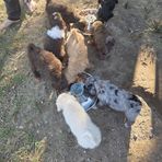 Aussiedoodle puppies include apricot, blue merle, red merle, and black phantom. Colors will vary depending on the parent dogs.
