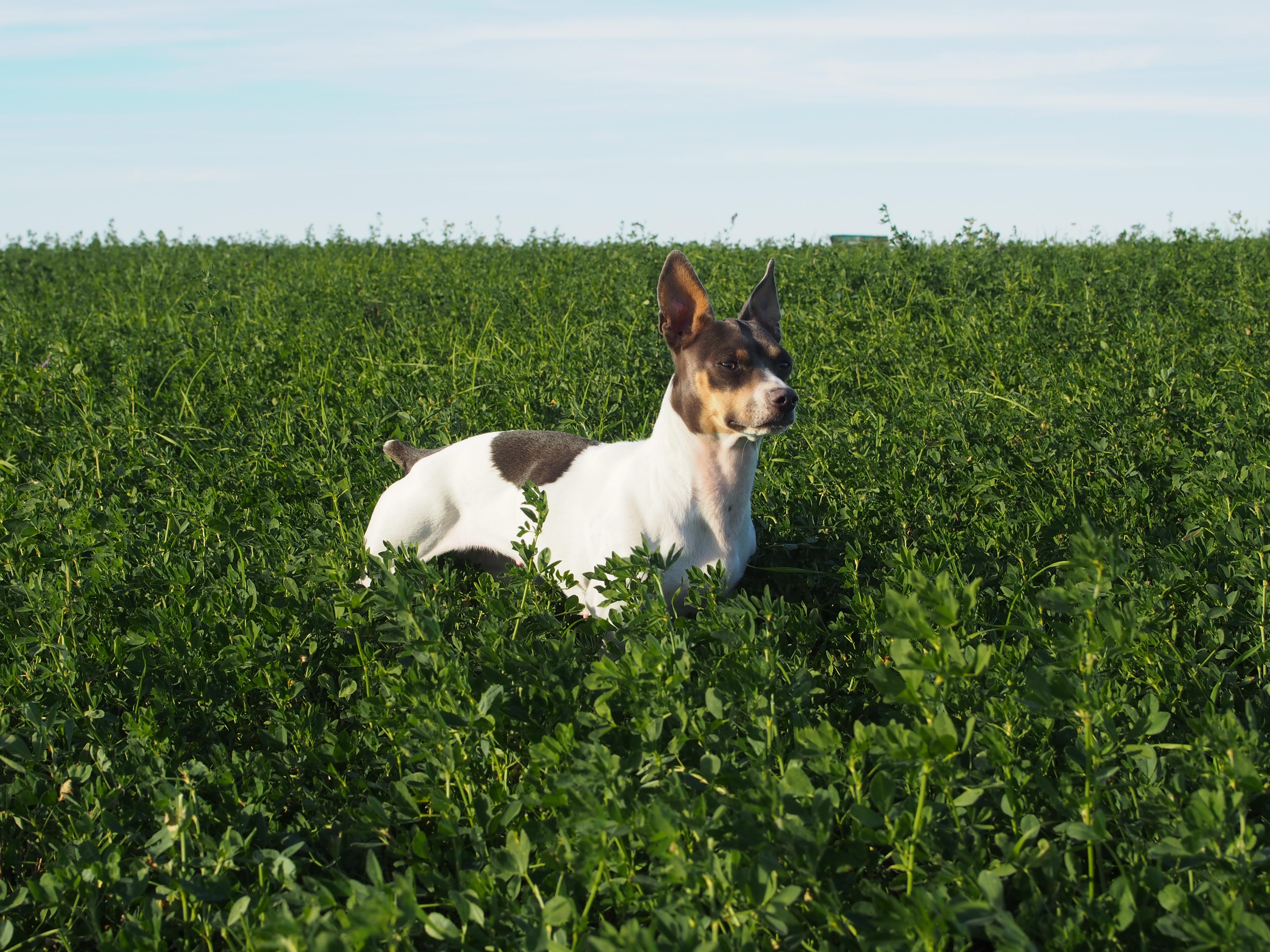 Freya is an absolute cuddle bug. The only thing Freya loves more than a good snuggle is hunting; she can spend hours in the pasture poking her nose into holes and finding mice, ground squirrels, moles, and voles. Most of the time, the hunt is successful!