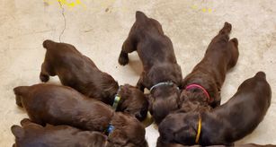 Our Cocker Spaniel puppies include brown and white, brown white and tan, and red and white. Boykin Spaniel puppies include chocolate and liver. Colors will vary depending on the parent dogs.