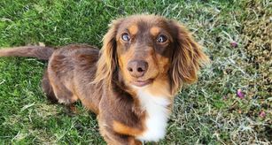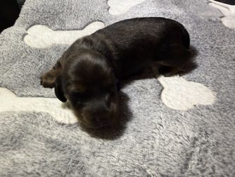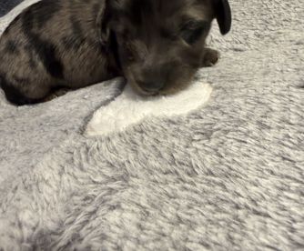 We don't talk about Bruno, but if we did we would let you know he is the most relaxed, go with the flow, uncovered dog we have ever owned. He may be small but he does not let that stop him. Bruno is a lovely AKC registered black and tan dapple piebald that carriers for cream and dilute.