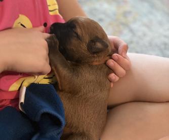 Pineapple has such a sweet personality she loves everyone. She is genetically tested and is cleared and AKC registered. She is well socialized with 2 human brothers and all their friends as well as her neighbor dog friends and dog brother. I love to go on adventures to the lake and on hikes with my family. Zoomies and running and jumping off my deck is two of her favorite thing to do in her backyard. She is just 2 and this is her first litter. She is a wonderful mother protective and caring. She is so proud of her puppies you can just tell when she beams up at you.