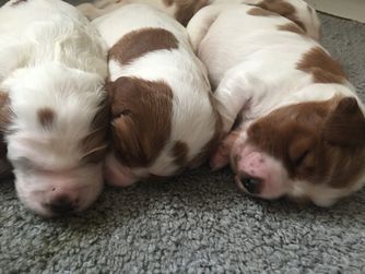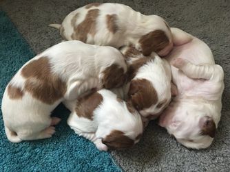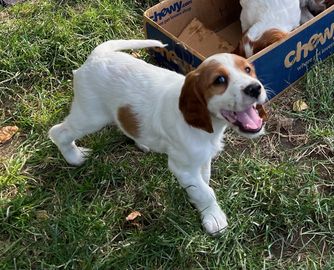 Our puppies are red and white. Colors will vary depending on the parent dogs.