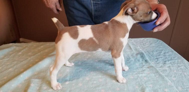 Leeannan is a female Rat Terrier. Carefully selected as a great representative of her breed, Kim decided to make her part of their program. Kim has passed Good Dog’s screening process, which involved a review of their breeding practices, environment, and the mental and physical health of their dogs.