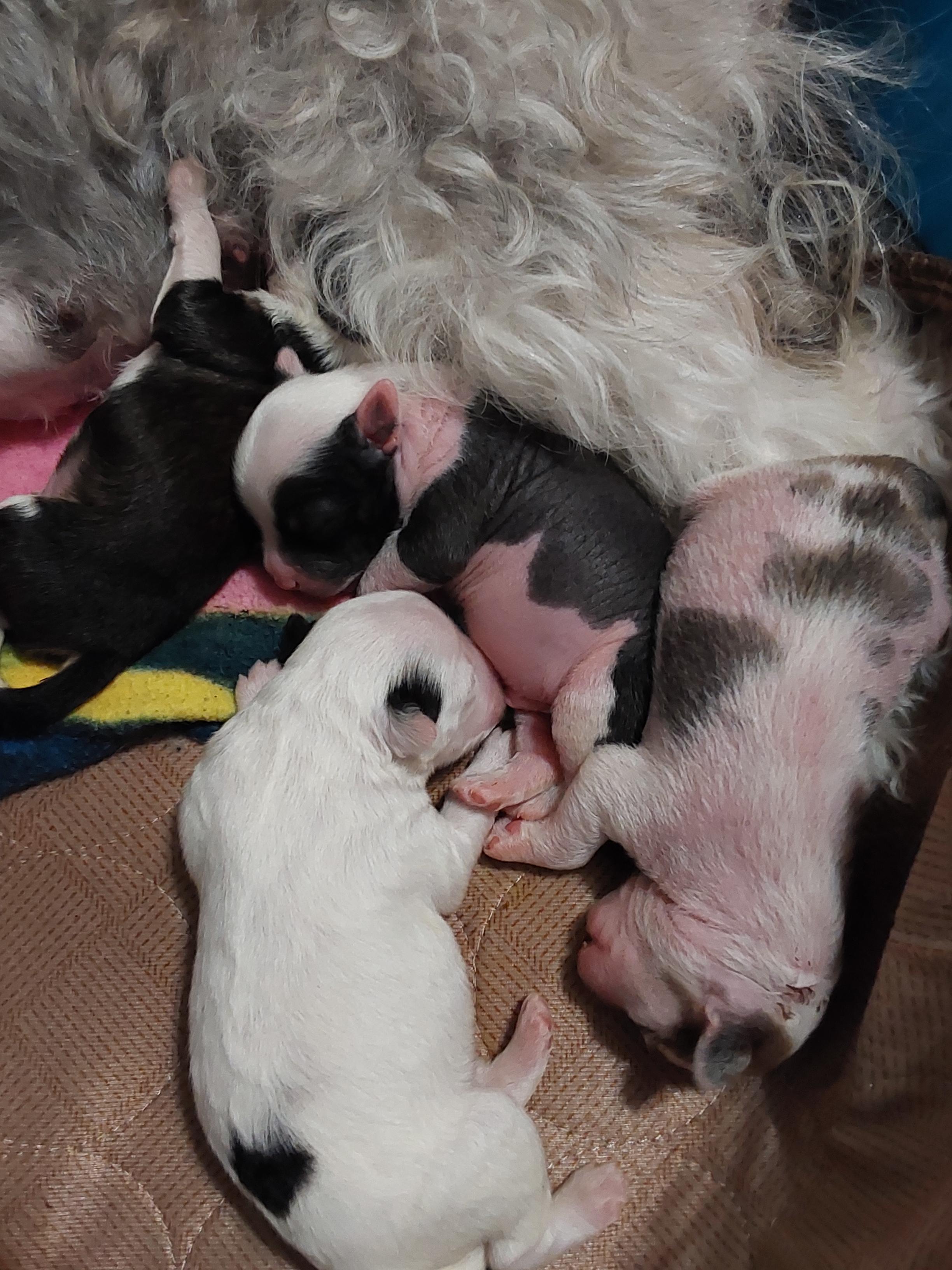 Our puppies include white and black, white and chocolate, and black and white. Colors will vary depending on the parent dogs.