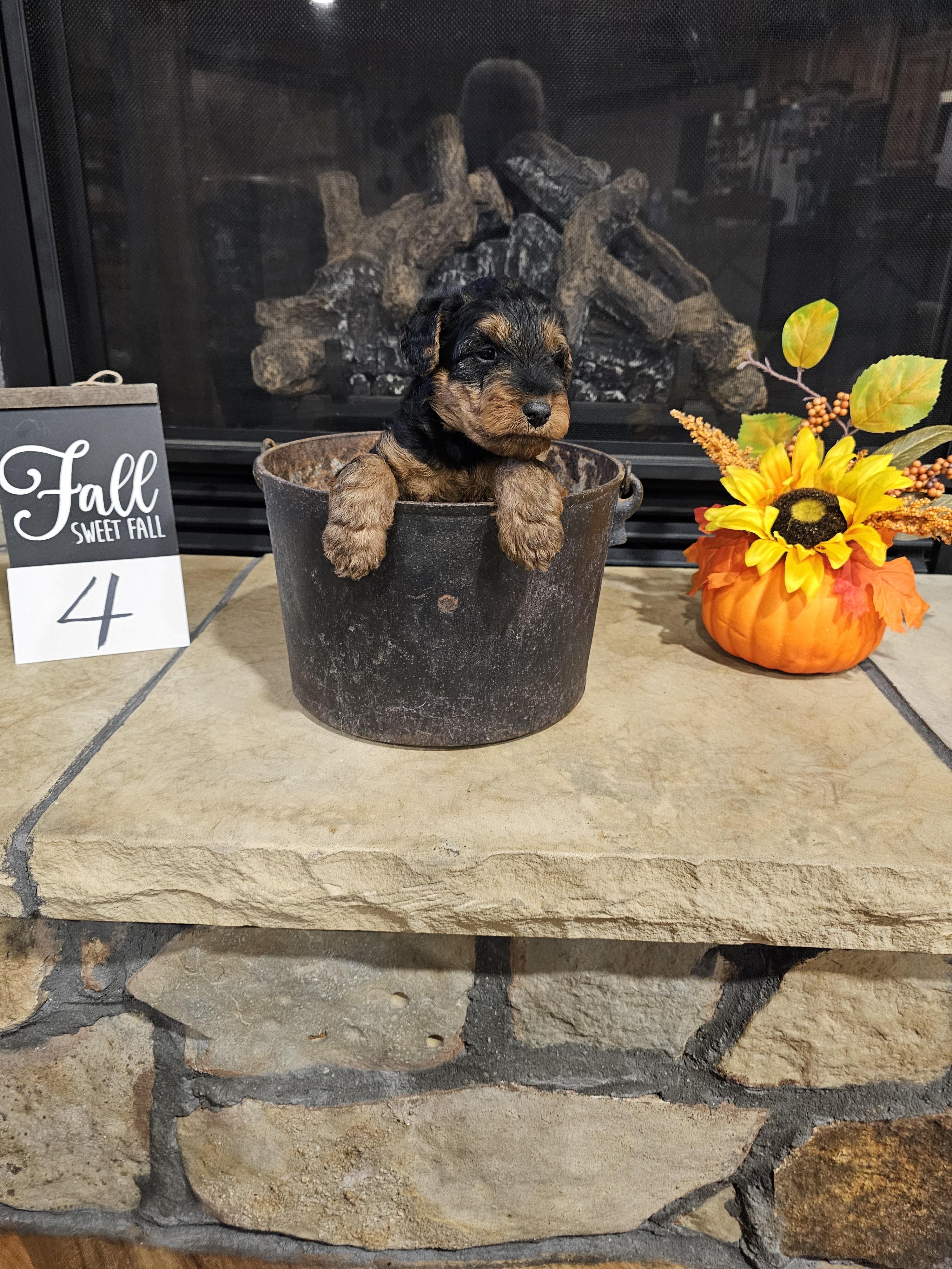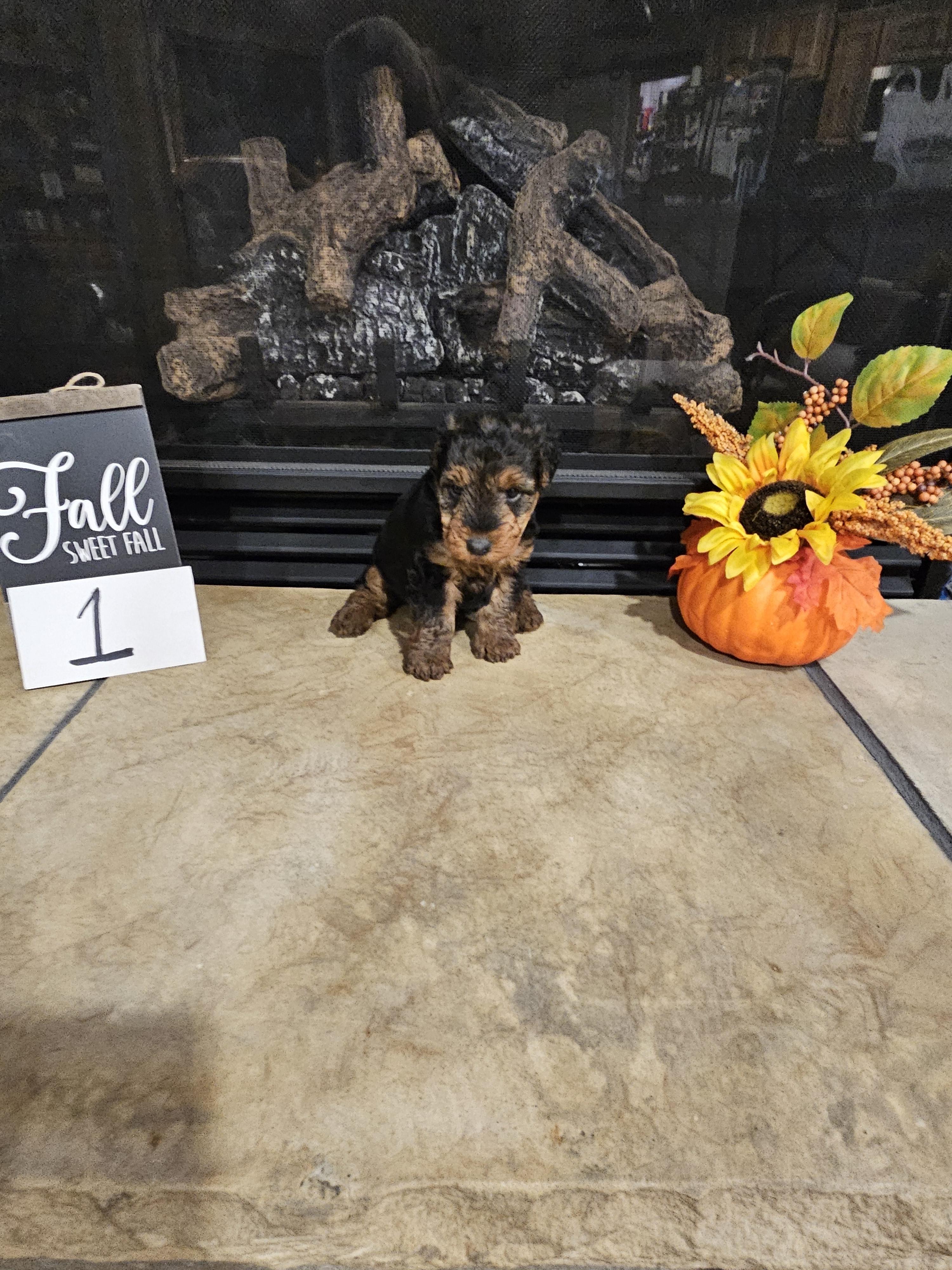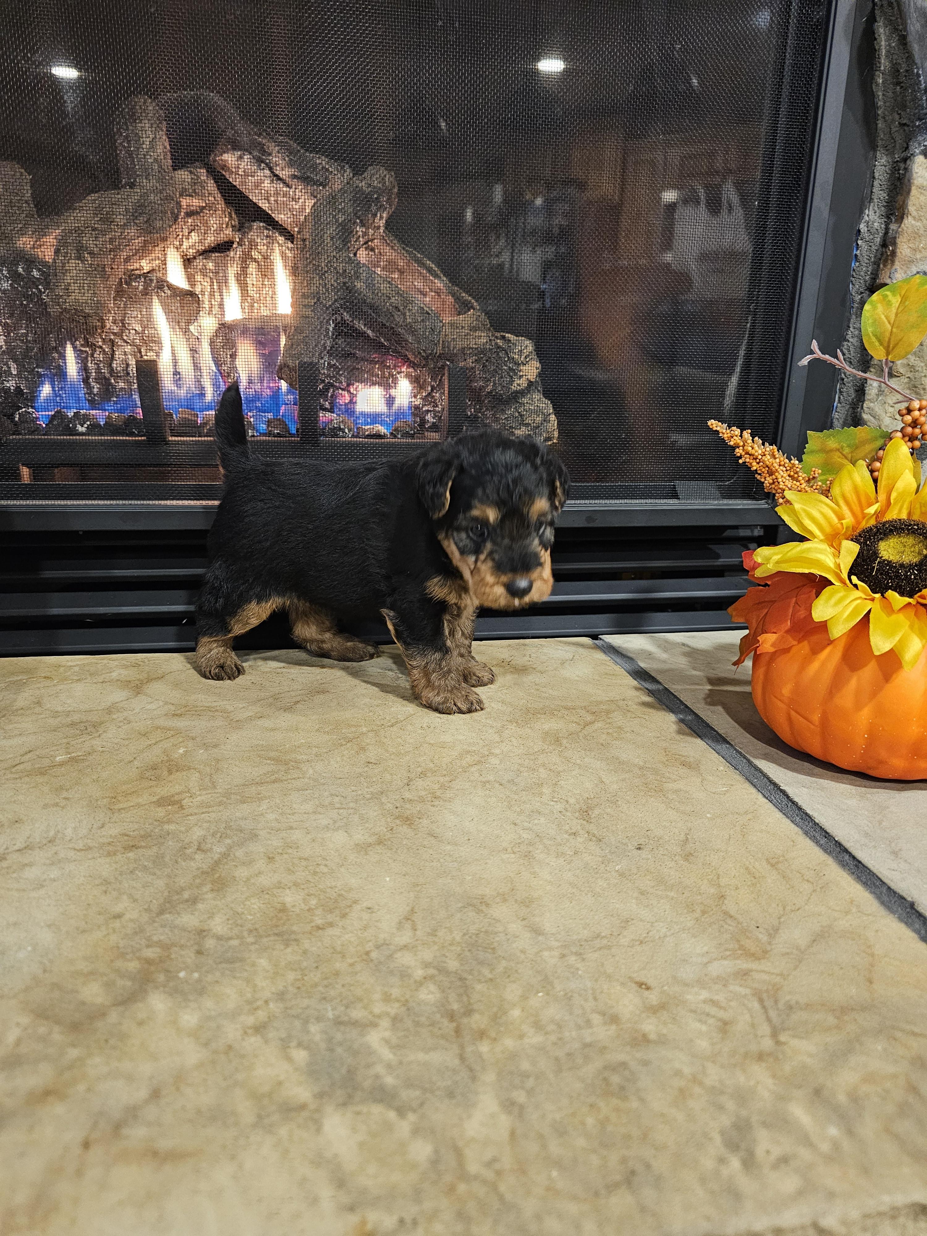 Our Airedale Terrier puppies are black and tan. Welsh Terrier puppies are black and tan. Colors will vary depending on the parent dogs.