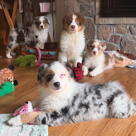 Our puppies include black, red merle, blue merle, and red. Colors will vary depending on the parent dogs.