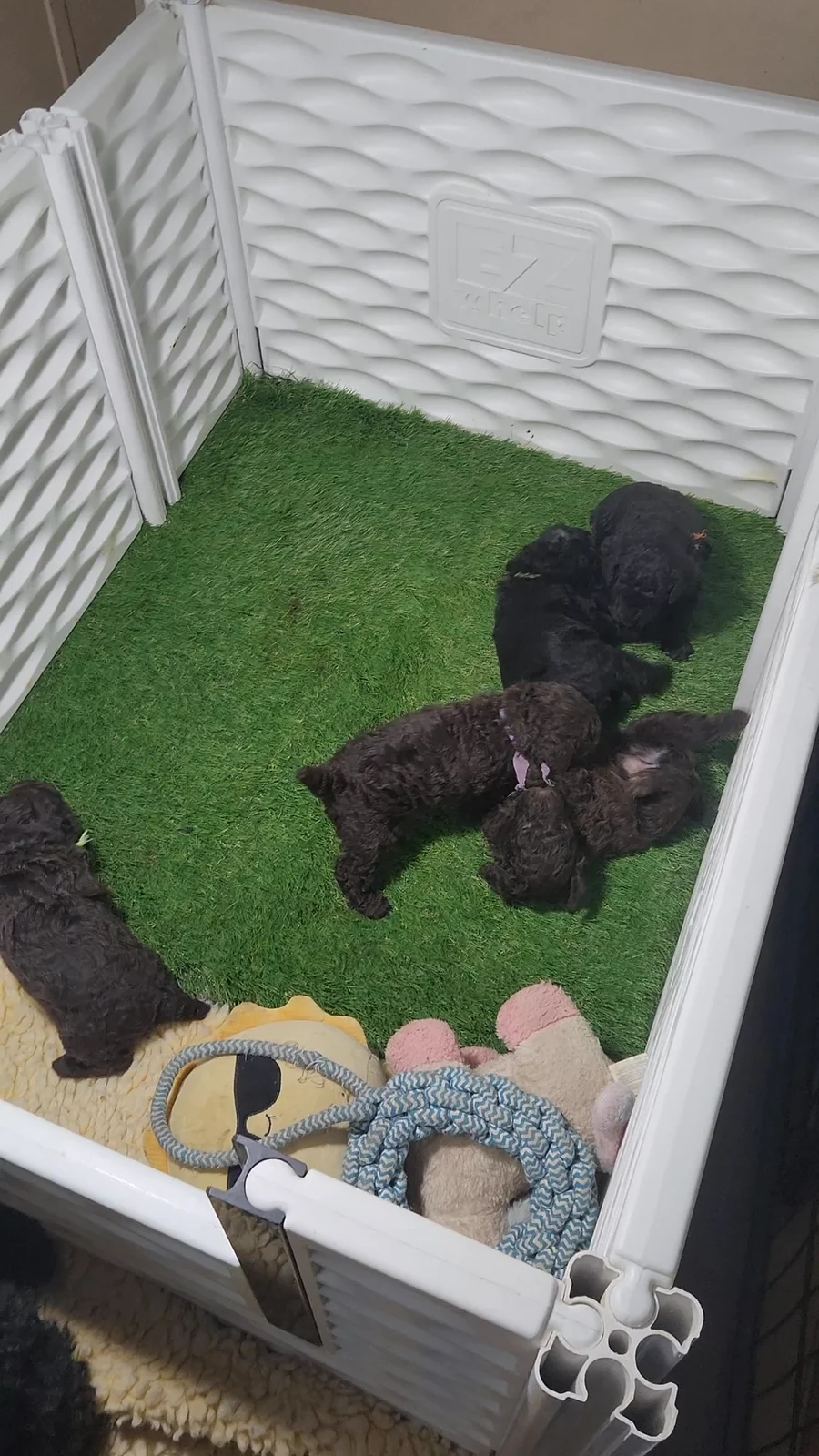 Our puppies include black, blue, brown, cafe au lait, and parti. Colors will vary depending on the parent dogs.