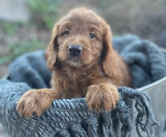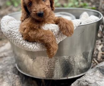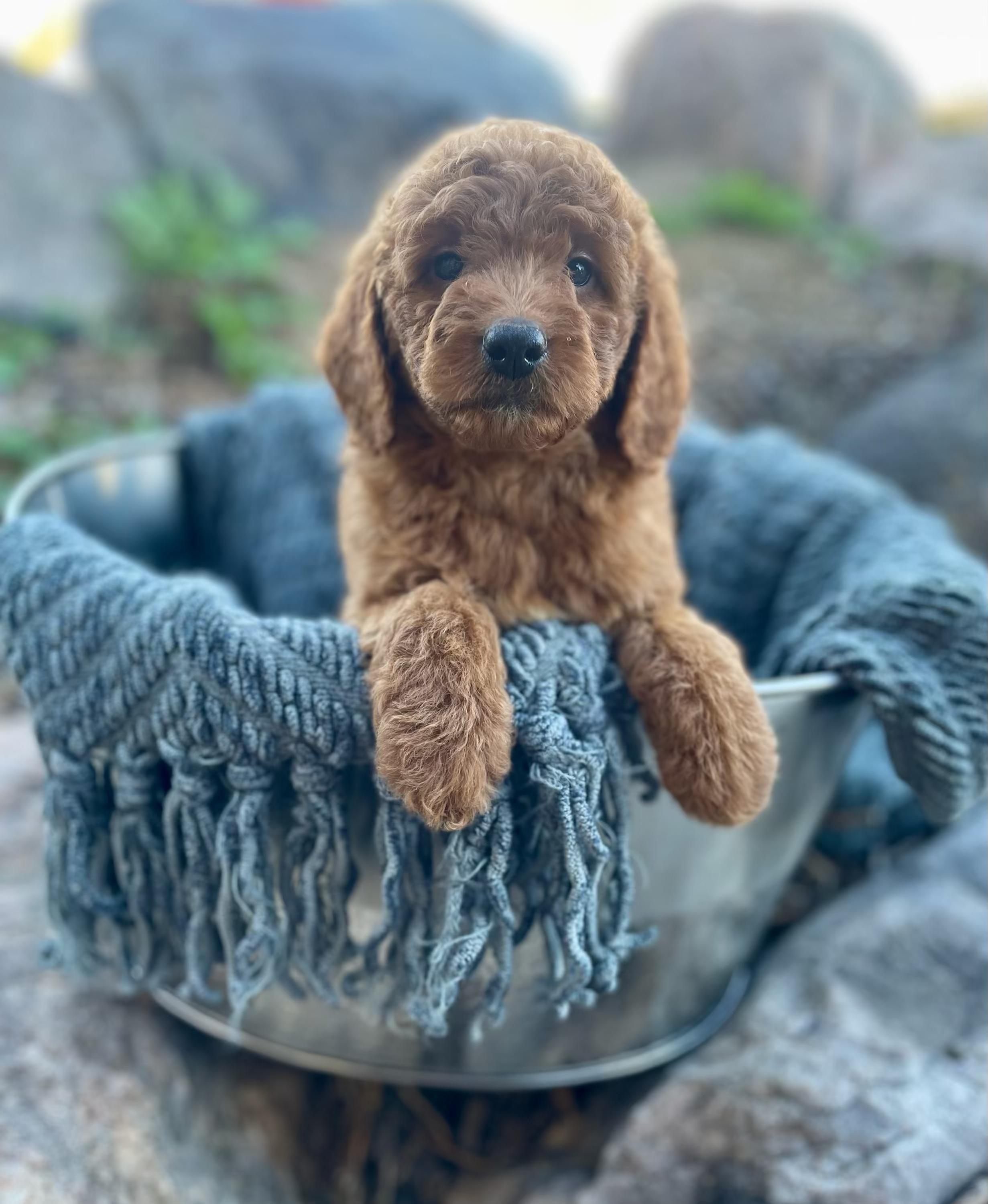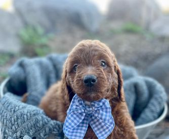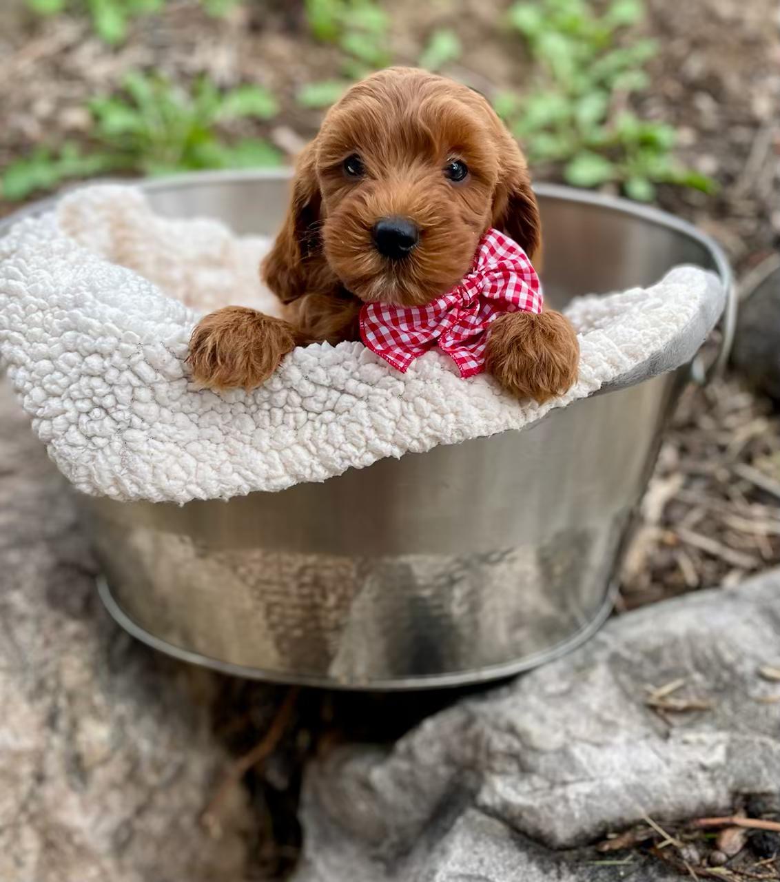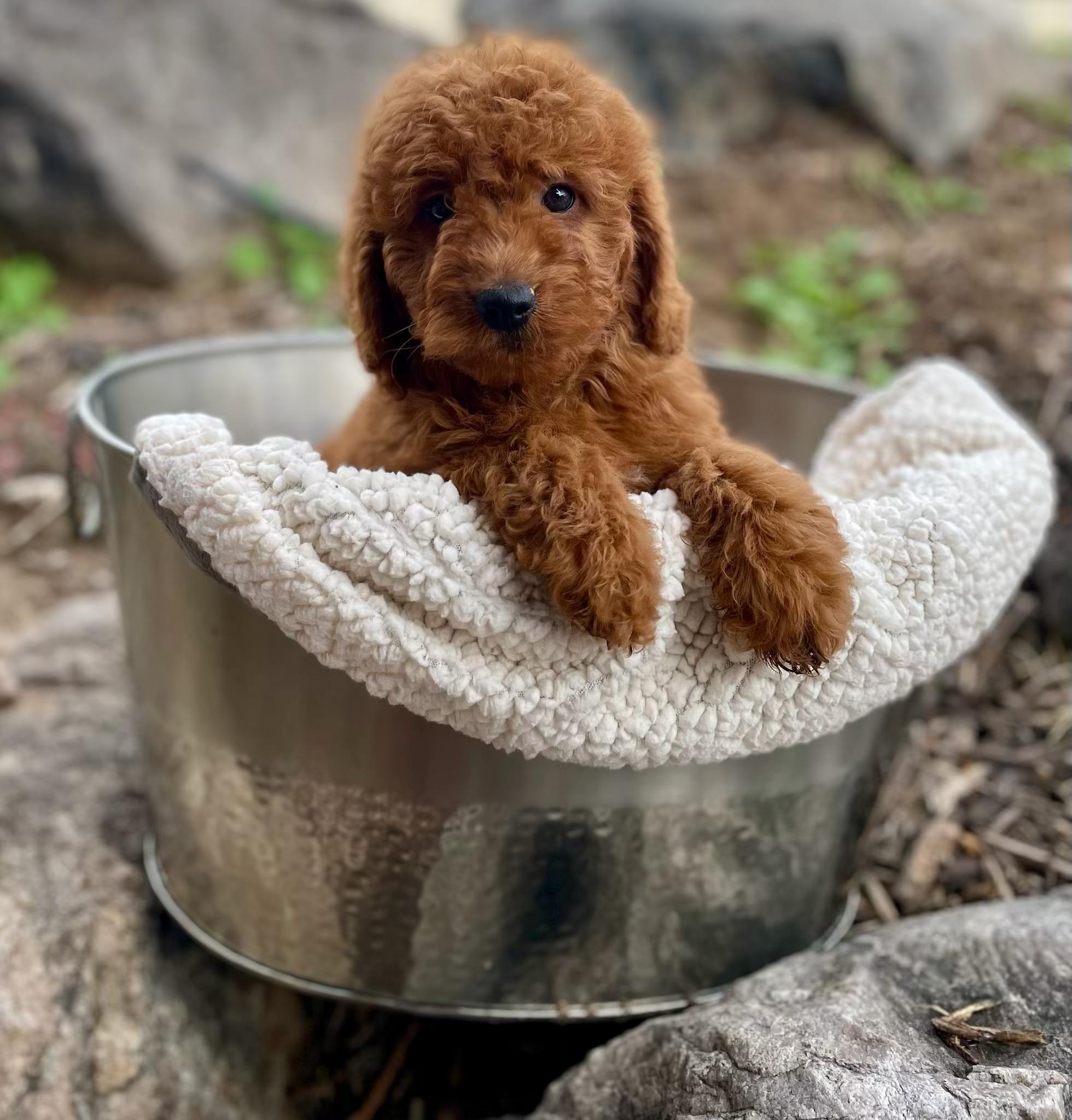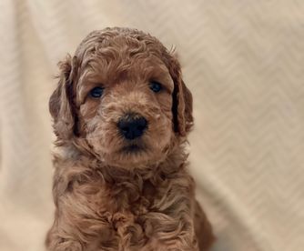 Our Bernedoodle puppies include red, tri-color, and merle. Cavapoo puppies include tri-color, black and white, and red. Goldendoodle puppies include cream, red, and merle. Poodle puppies include red and brindle. Colors will vary depending on the parent dogs.