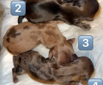 Our puppies include piebald, red, chocolate and tan, black and tan, and dapple. Colors will vary depending on the parent dogs.
