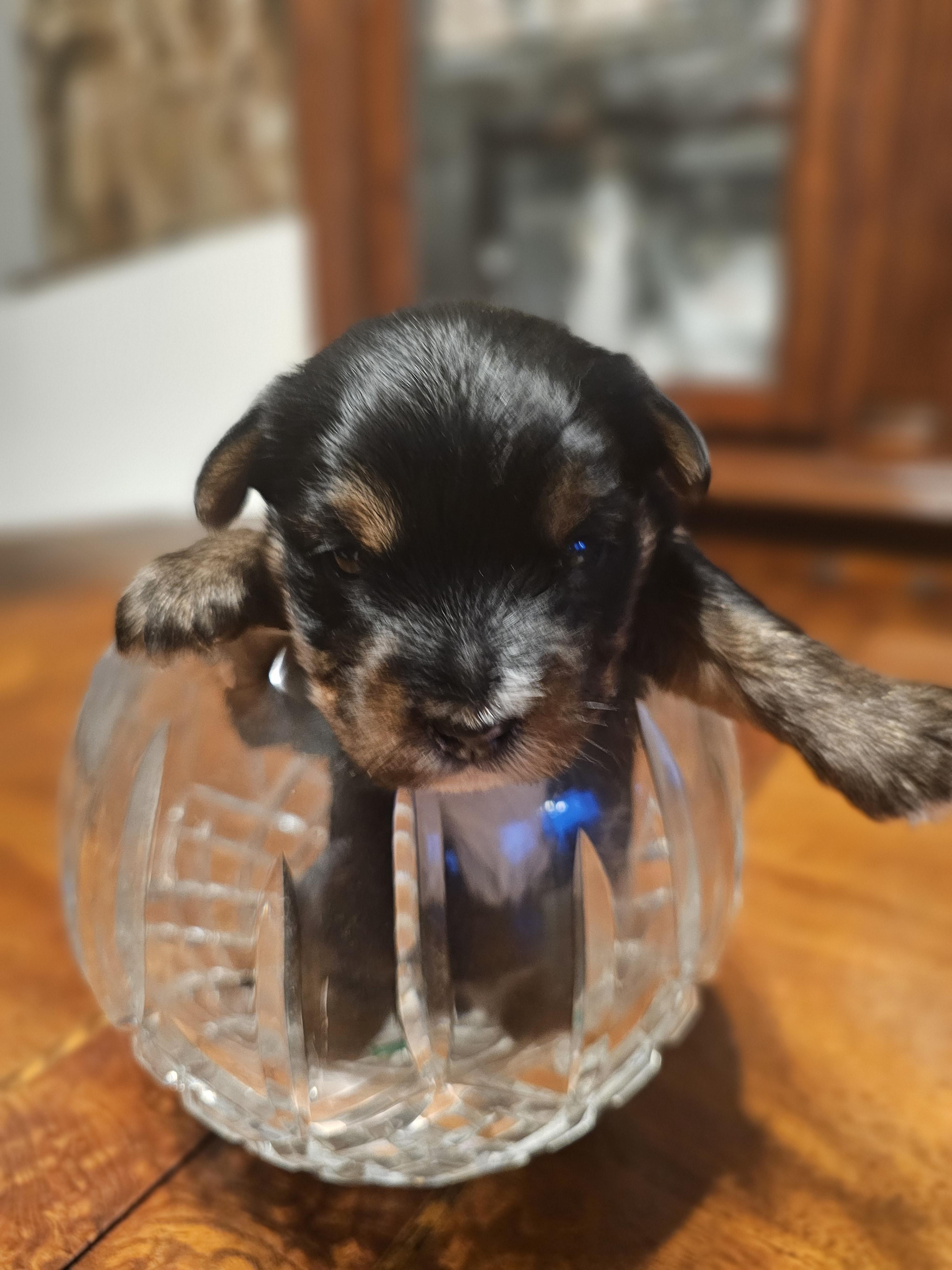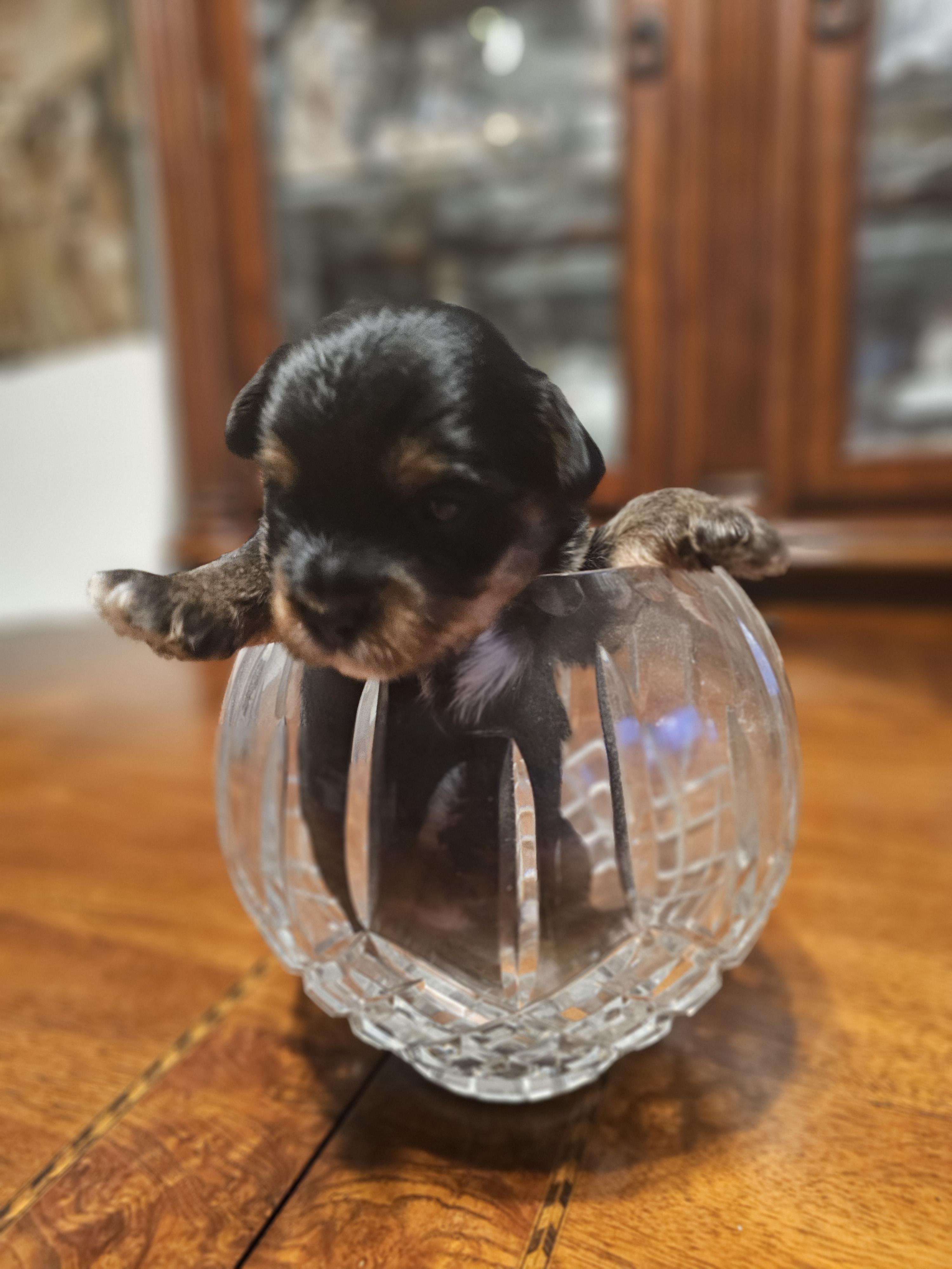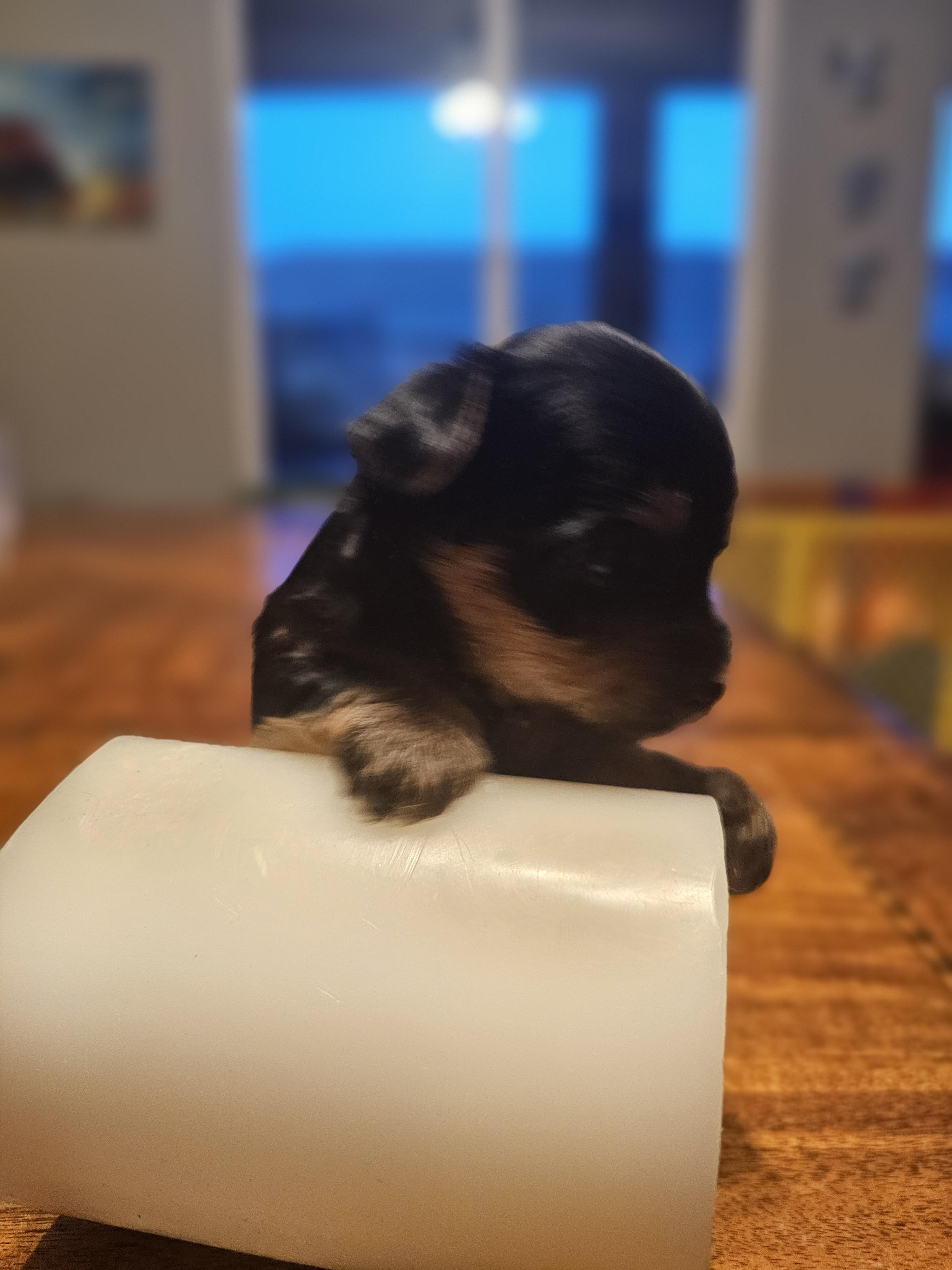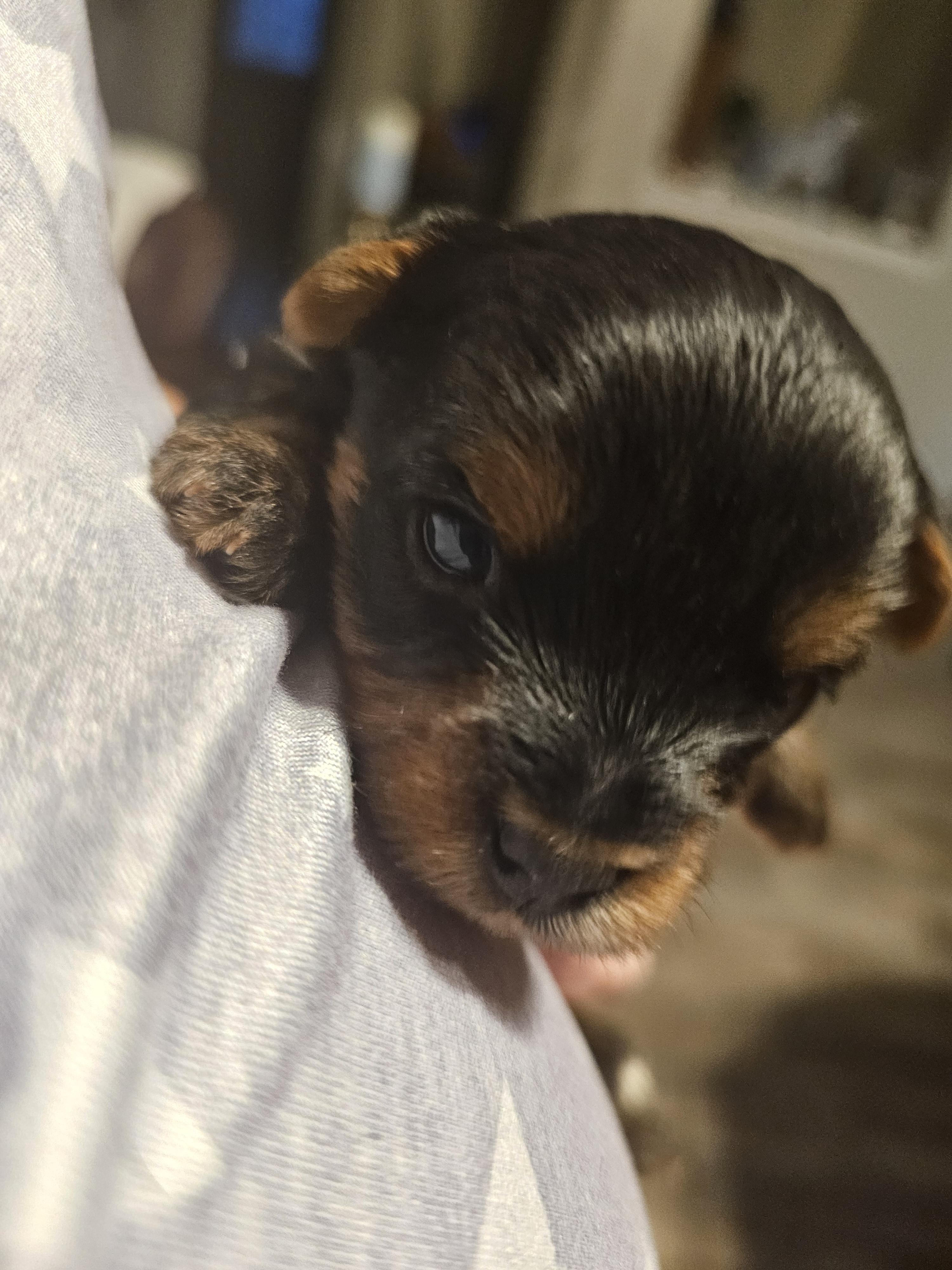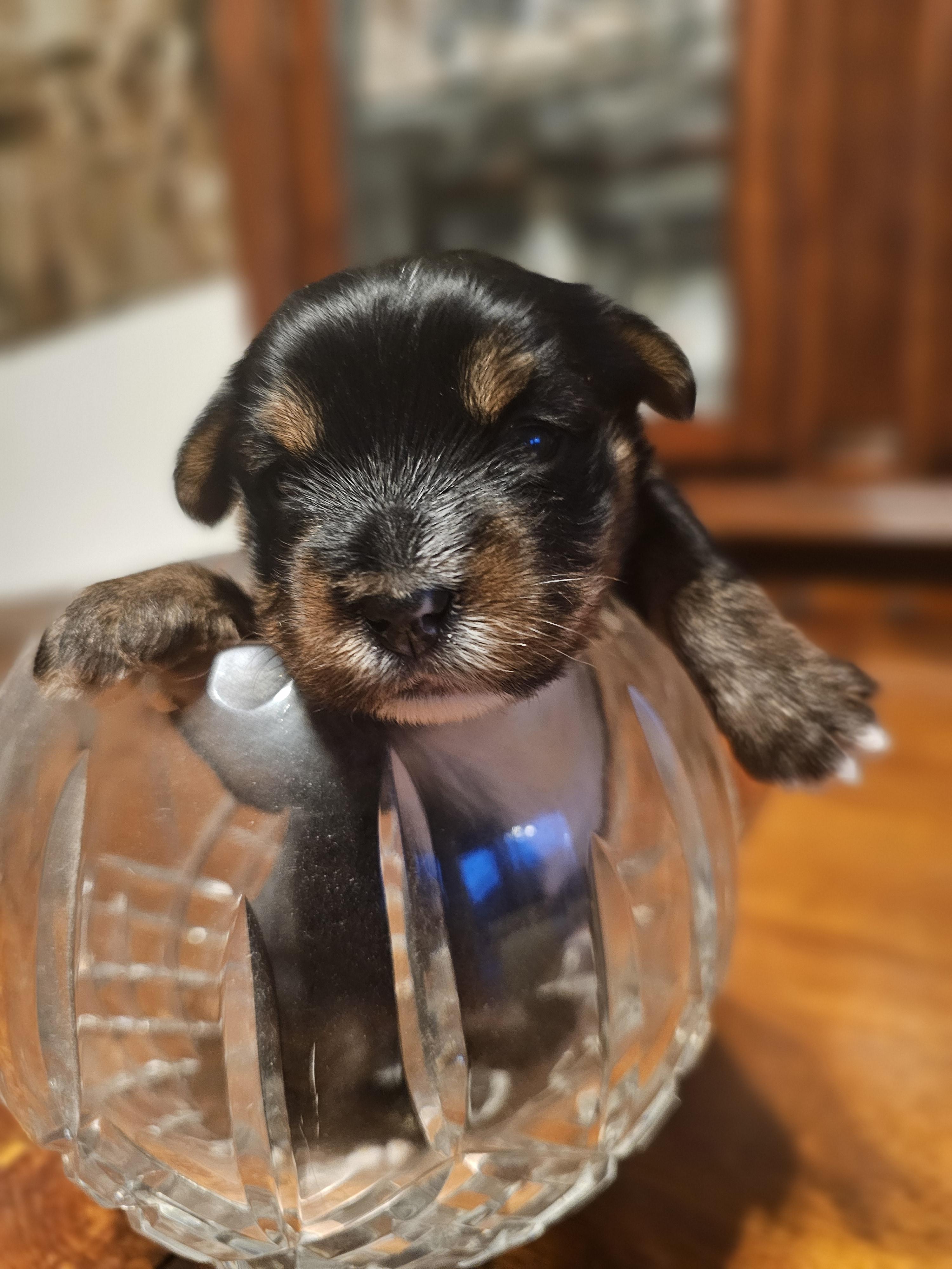 Our Biewer Terrier puppies are black tan and white. Yorkshire Terrier puppies are black and tan. Colors will vary depending on the parent dogs.